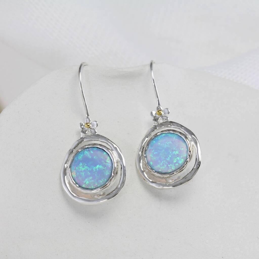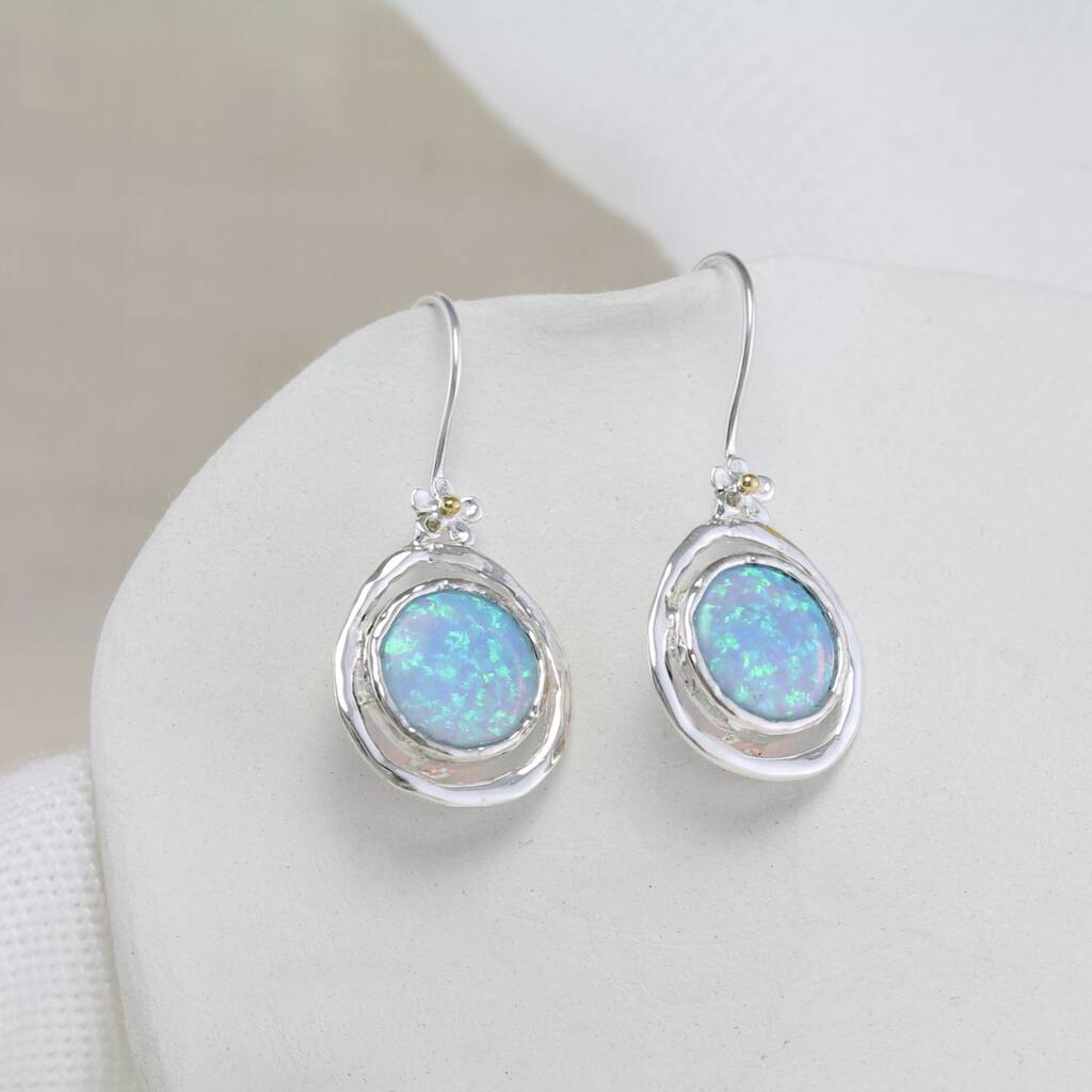 Beautiful, large round fire Opals sit centre stage of these eye-catching hook earrings, which also feature a tiny flower detail.The unique combination of Sterling Silver and the flowing design make this piece a true statement of elegance and sophistication. If you are searching for a meaningful gift or an elegant anniversary gift, this is the perfect gift for her. Opal is the birthstone of October, but we think its vibrant colour is a perfect complement for year-round styling for anyone who loves coastal life.
