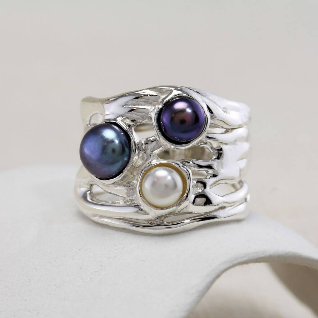 A Sterling Silver statement ring set with 3 freshwater pearlsThis exquisite Sterling Silver ring has a trio of glorious Freshwater Pearls - two black and one white, set on a curving band created using our unique wax form.