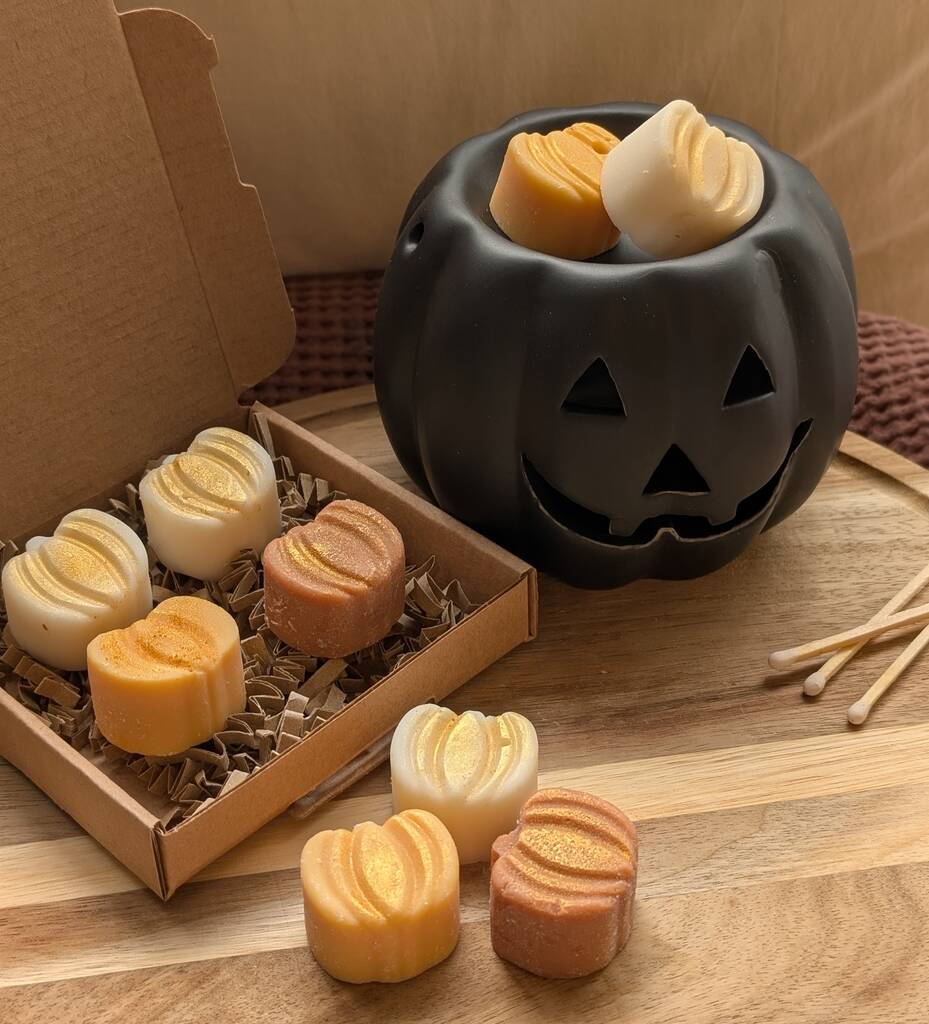 A ceramic wax melt burner with chunky pumpkin melts in a scent of your choice. Hand decorated with glitter that shines as the wax melts
