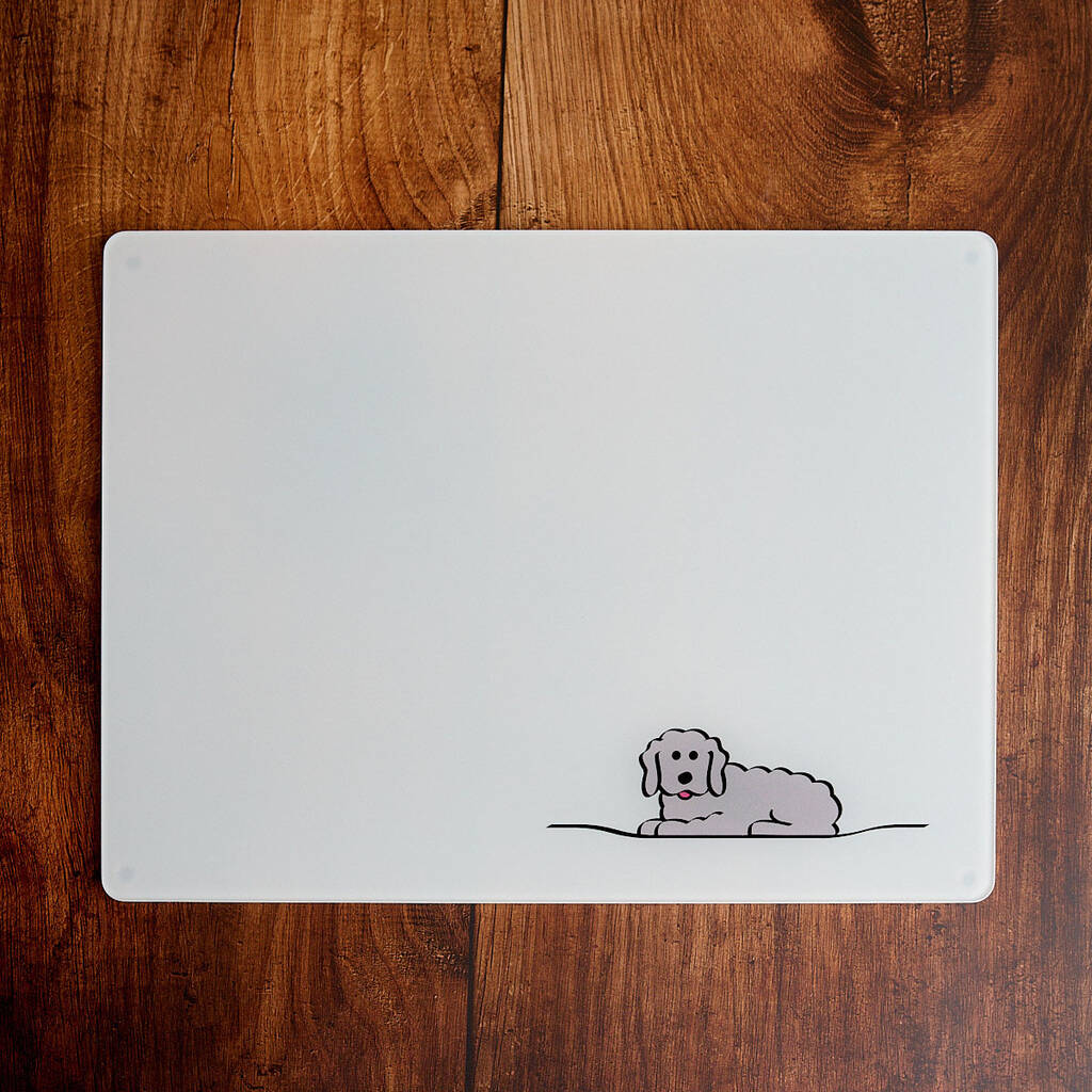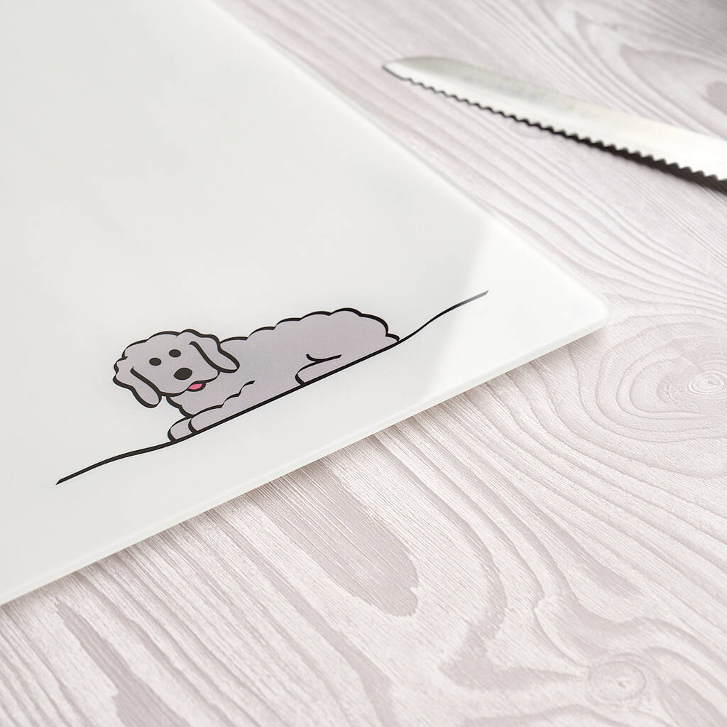 Beautiful, stylish and practical, this worktop saver features Fluffy Dog - a simple illustration on recycled, toughened glass. Perfect for protecting kitchen worktops.