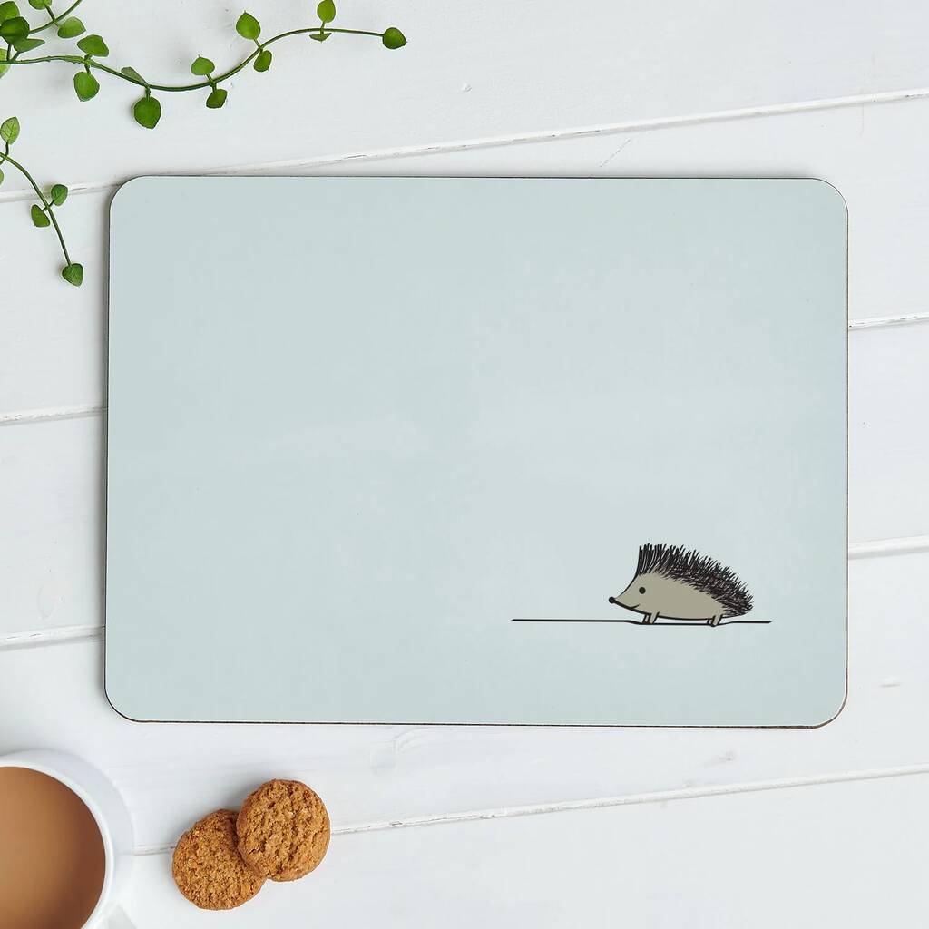 Brighten up your table with this popular Headgehog Placemat. Cute illustration on a soft sage grey background. Melamine placemat with cork backing made in UK