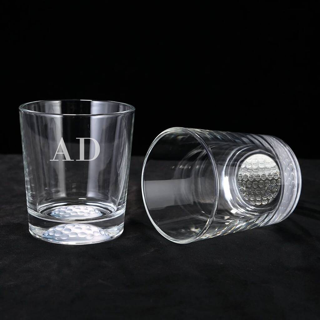 A premium quality Monogrammed Frosted Golf Ball Base Glass Tumbler - the perfect birthday, retirement, Father's Day or Christmas gift for a golf fan.
