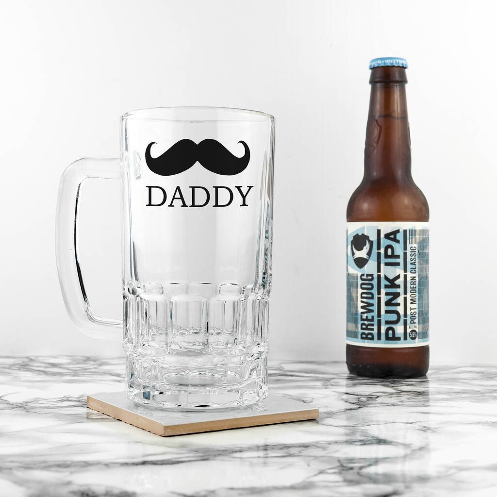 A charming Personalised Moustache Beer Glass Tankard - the perfect Father's Day, birthday or Christmas drinkware gift for him.