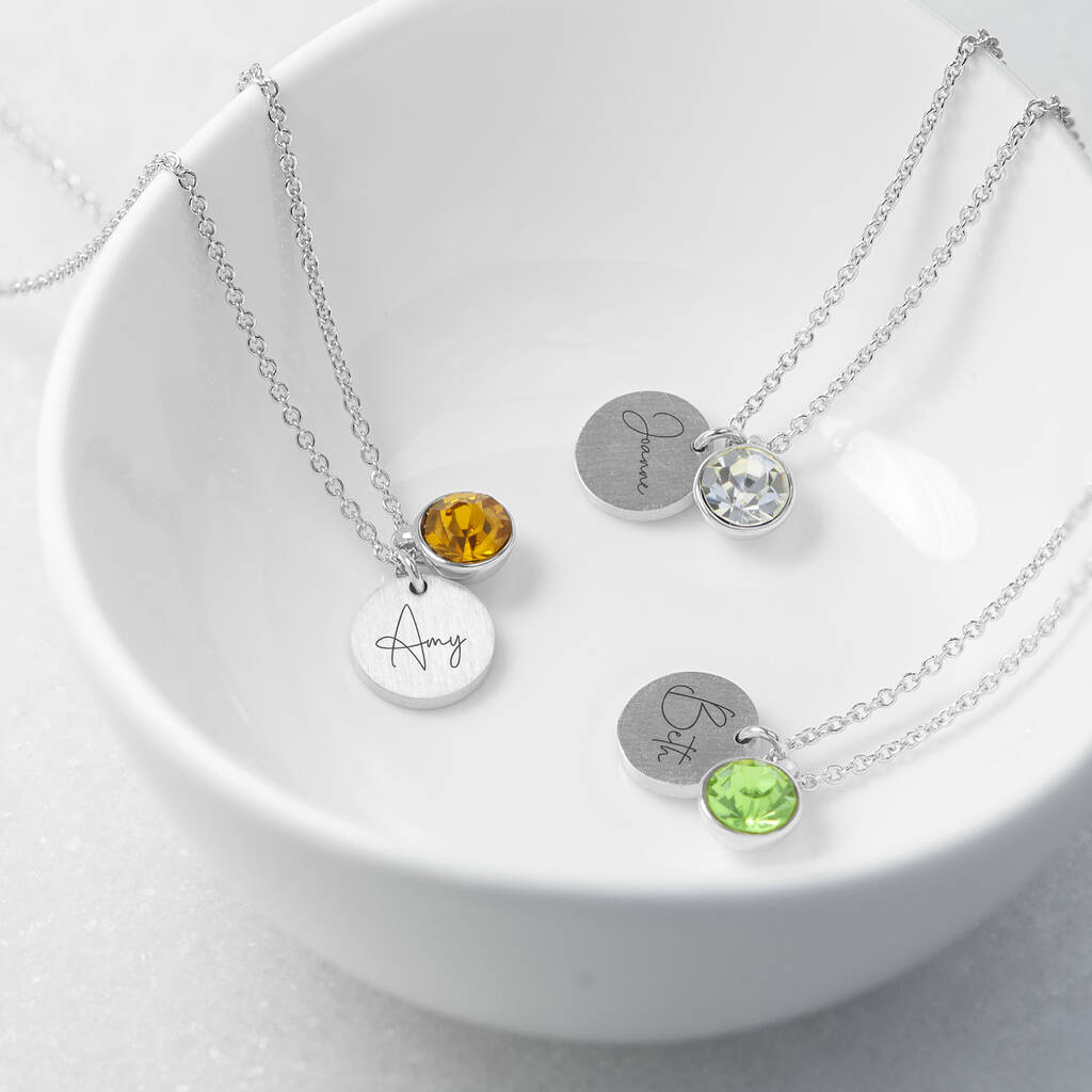 Personalised Silver Birthstone Crystal + Disc Necklace