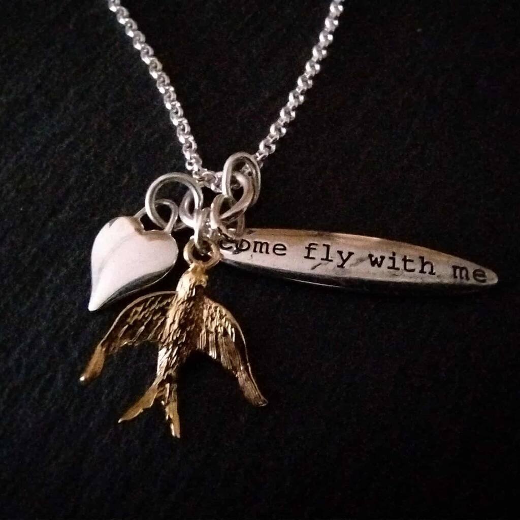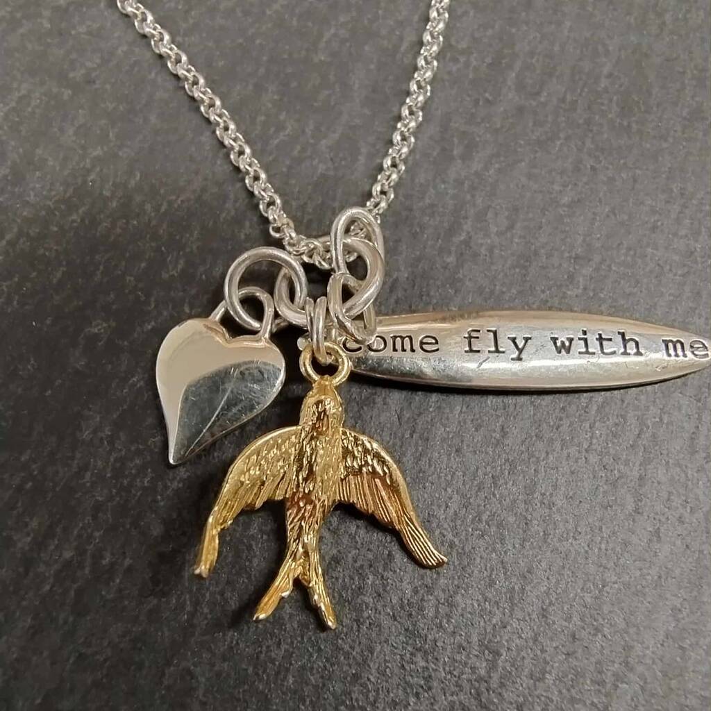 The first charm, a sleek sterling silver heart, embodies love and affection. Its smooth, mirror-polished surface reflects light elegantly, symbolising purity and devotion. Nestled alongside it is a slender silver tag pendant, gracefully engraved with the heartfelt phrase ‘come fly with me’. This poetic inscription evokes a sense of shared journey and invitation; a promise of companionship and adventure, whether in life, love or spirit. Completing the trio is a beautifully detailed golden bird charm, poised as though in mid-flight. The swallow bird, rendered in warm gold tones, symbolises freedom, aspiration and the courage to explore new horizons. Together, these elements create a delicate and meaningful design that celebrates both love and liberation.