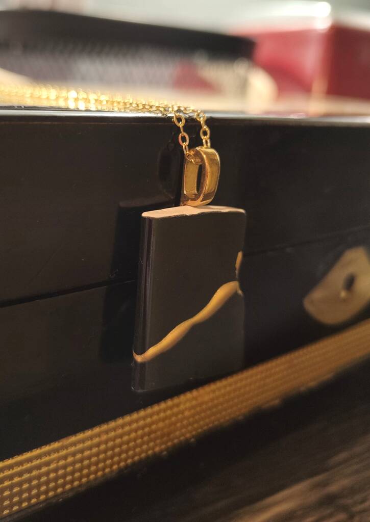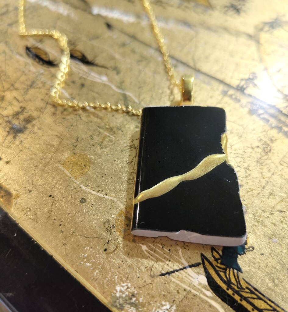 Beautiful genuine kintsugi necklace, created using the modern Japanese kintsugi technique.This unusual pendant is one of a collection fashioned from recycled ceramics, carefully sanded and repaired by hand using kintsugi. Perfect for any lover of Japanese culture and art of for a loved one.