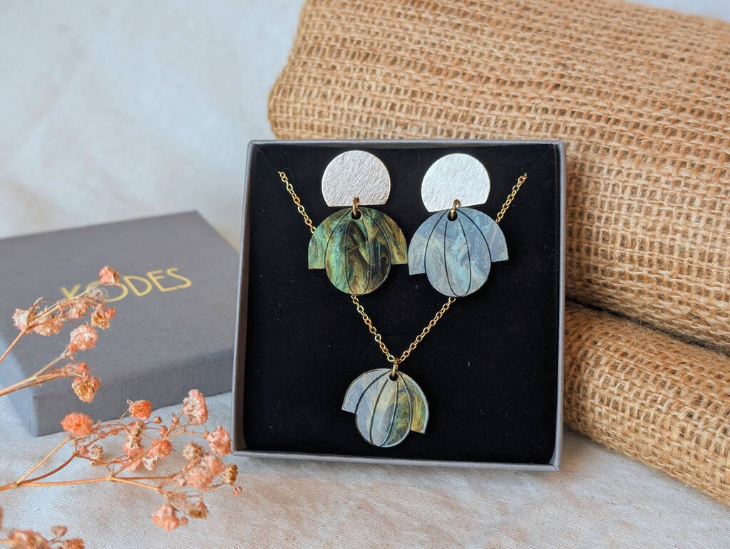 Treat someone special, or yourself, to Bloom Deco green marble earrings and necklace, where neutrals, rich marbling and gold accents create an elegant Deco statement.This gift set pairs the Bloom Deco green marble earrings with the matching necklace, bringing together sculptural fan shapes, soft neutrals, rich marbling and gold accents. The earrings feature a gold plated stud with a lightweight green marbled acrylic drop that moves beautifully while remaining comfortable all day. The coordinating pendant hangs from a gold plated chain and works as a standalone statement or layered over knitwear and blouses. Keep pieces separate from other jewellery and leave hook protectors on to prevent scratches. KODES statement jewellery is handmade in Tottenham, North London, by Morena Fiore since 2015.