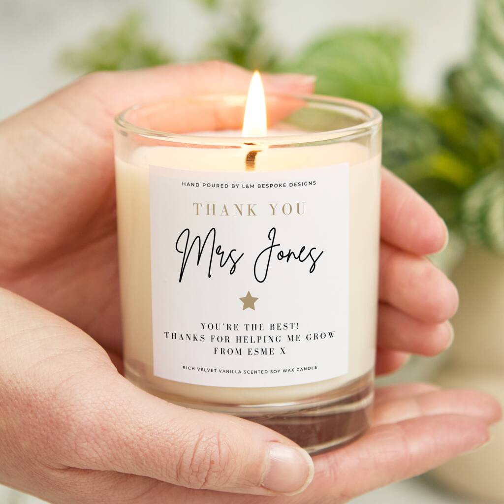 A special way to say thank you to your teacher with this bespoke soy wax candle keepsake. Personalise with a special message for a unique thank you gift and to show appreciation to your teacher for all their help this year.