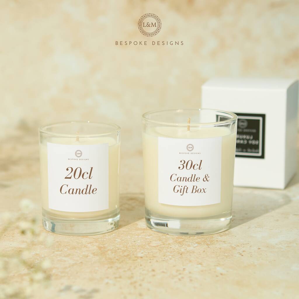 • 30cl Clear Candle Gift Set: This includes the 30cl clear candle plus candle gift box and branded matches wrapped in our white recyclable box. Includes white shredded paper.