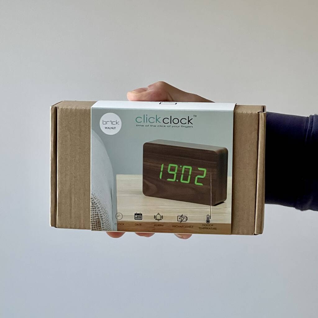 Click your fingers, clap your hands or gently tap your bedside table and the time, date & temperature will alternately appear for you in LED British designed and quality made rechargeable brick click clock with LED light. If you need to check the time in the middle of the night or early in the morning, you can just give a gentle tap to your bedside table and the time will appear. No constant blinking digital glow, nor do you have to fumble to find your smartphone in the dark.