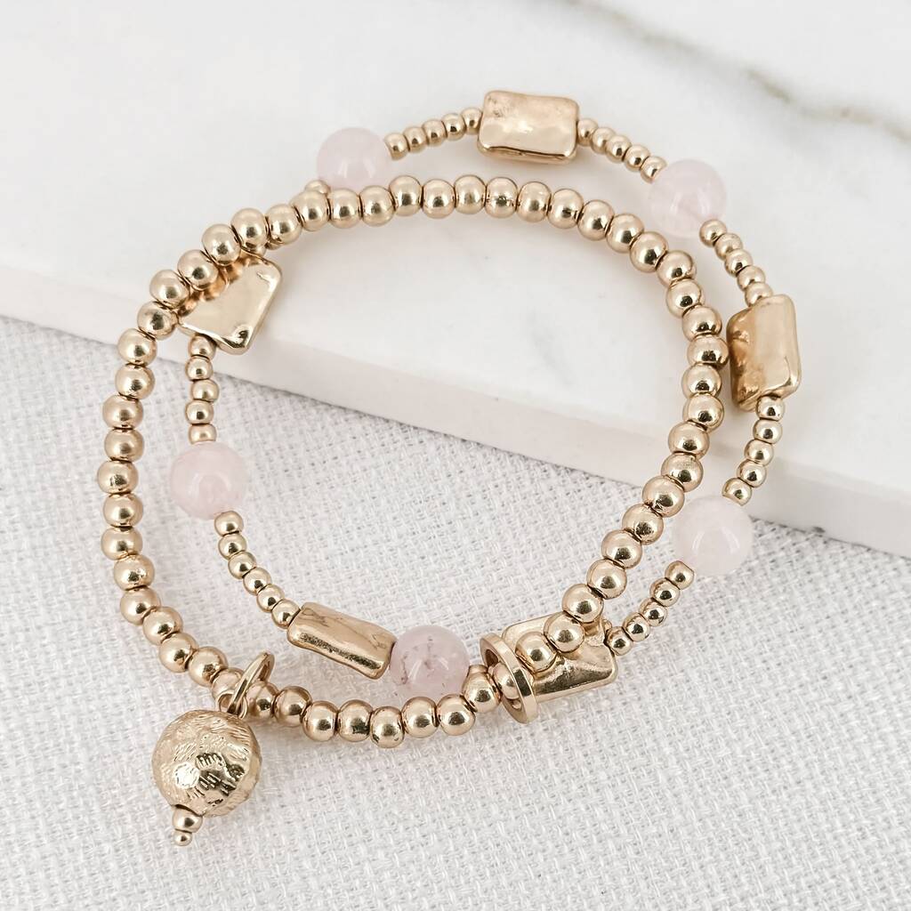 Layered Gold And Pink Bead Bracelet With Ball Charm