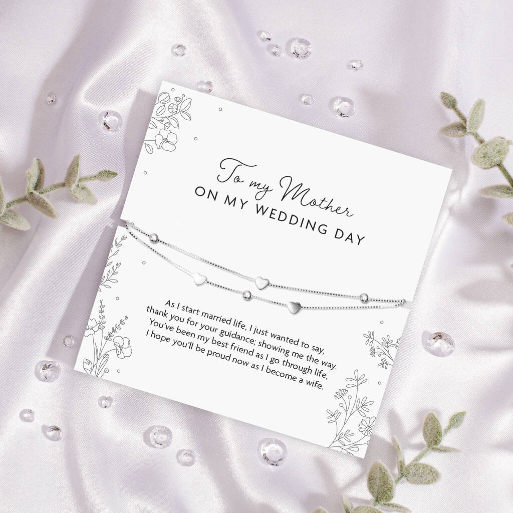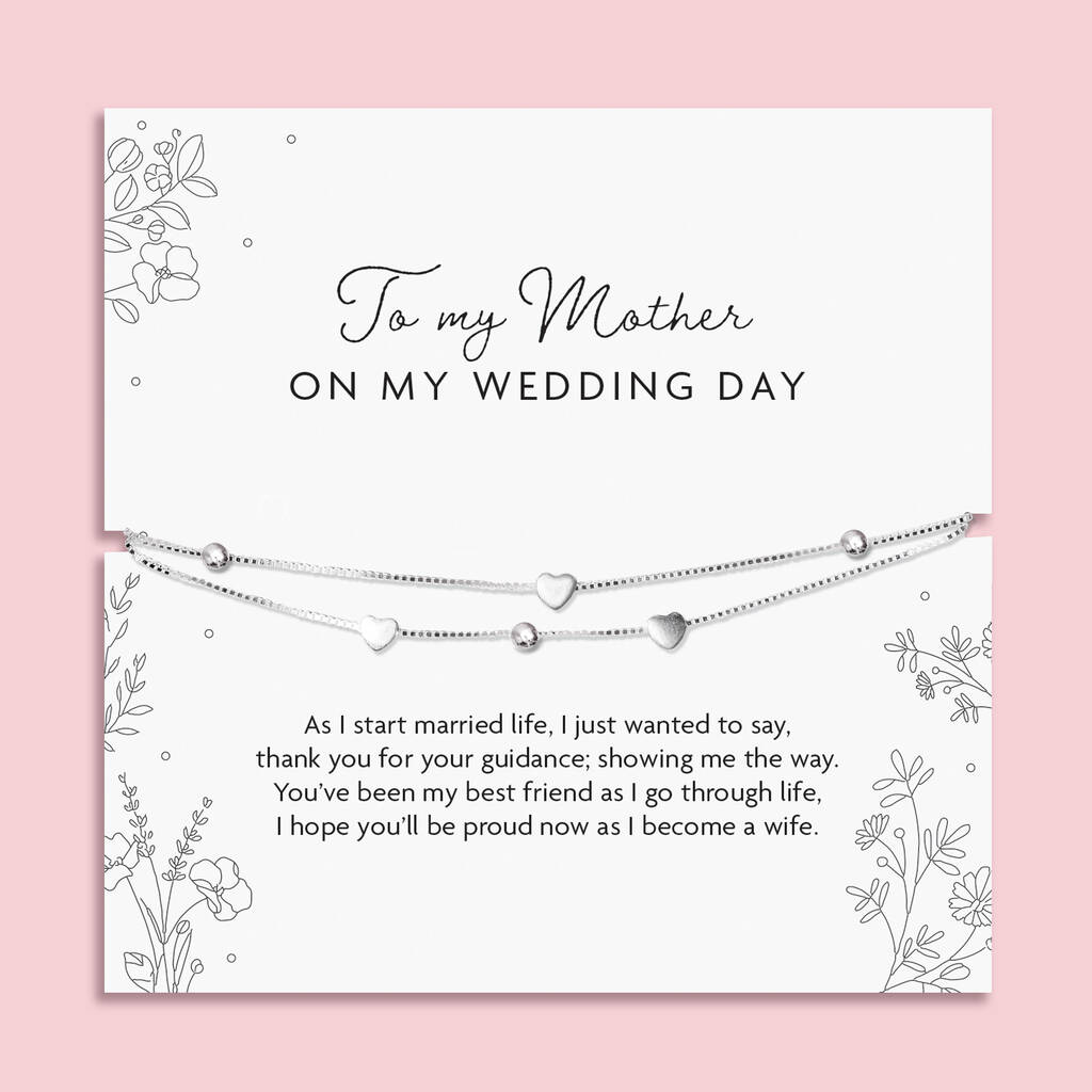 925 sterling silver and measuring 24cm, our bracelet features a delicate chain adorned with polished heart and bead details, creating a meaningful jewellery gift that mothers will treasure forever. Presented in a luxury white jewellery box, it arrives ready to gift, perfect for adding emotion and elegance to your wedding morning.