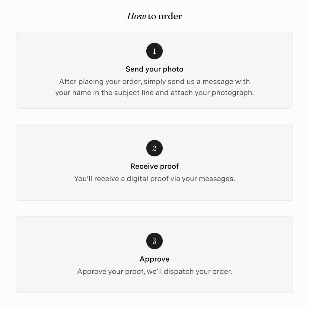 How do I send my photo? Once you have placed your order we will send you a link to upload your image.