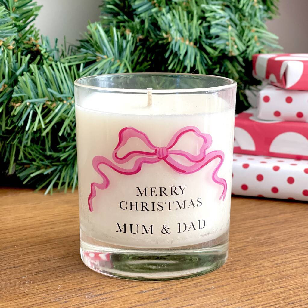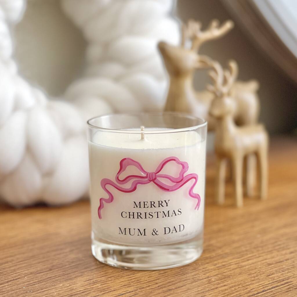 This keepsake candle adds a personal festive touch to any home this Christmas. Each candle features a stylish Christmas ribbon bow illustration which is bang on trend, the personalisation is printed below the caption 'merry christmas'