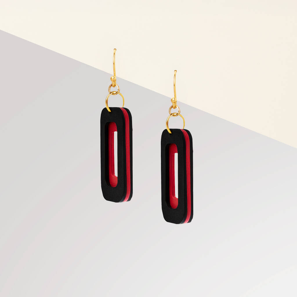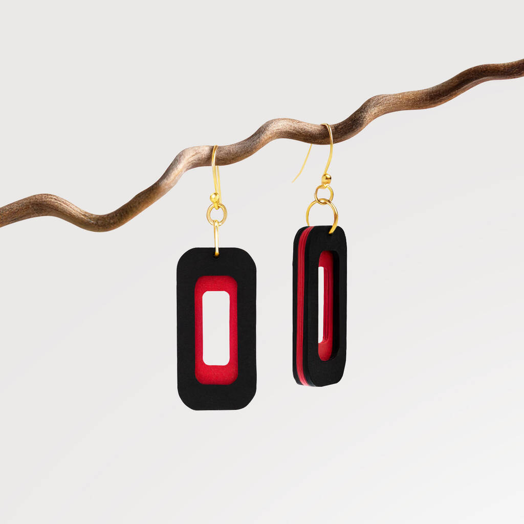 Black And Red Rectangle Earrings • Gold Plated Sterling Silver Hooks