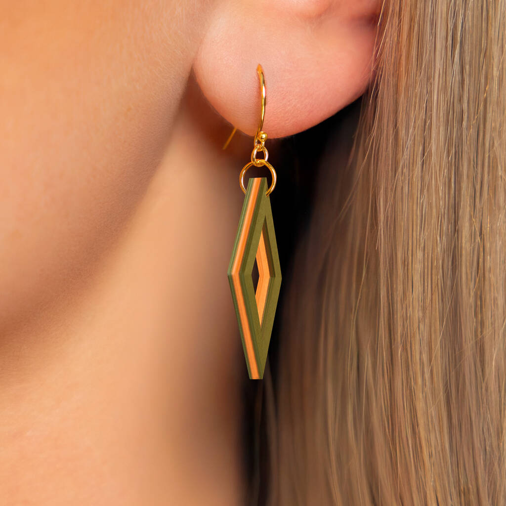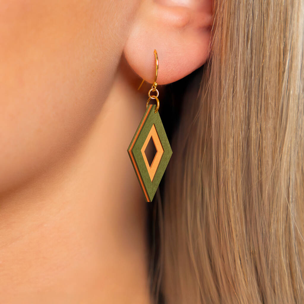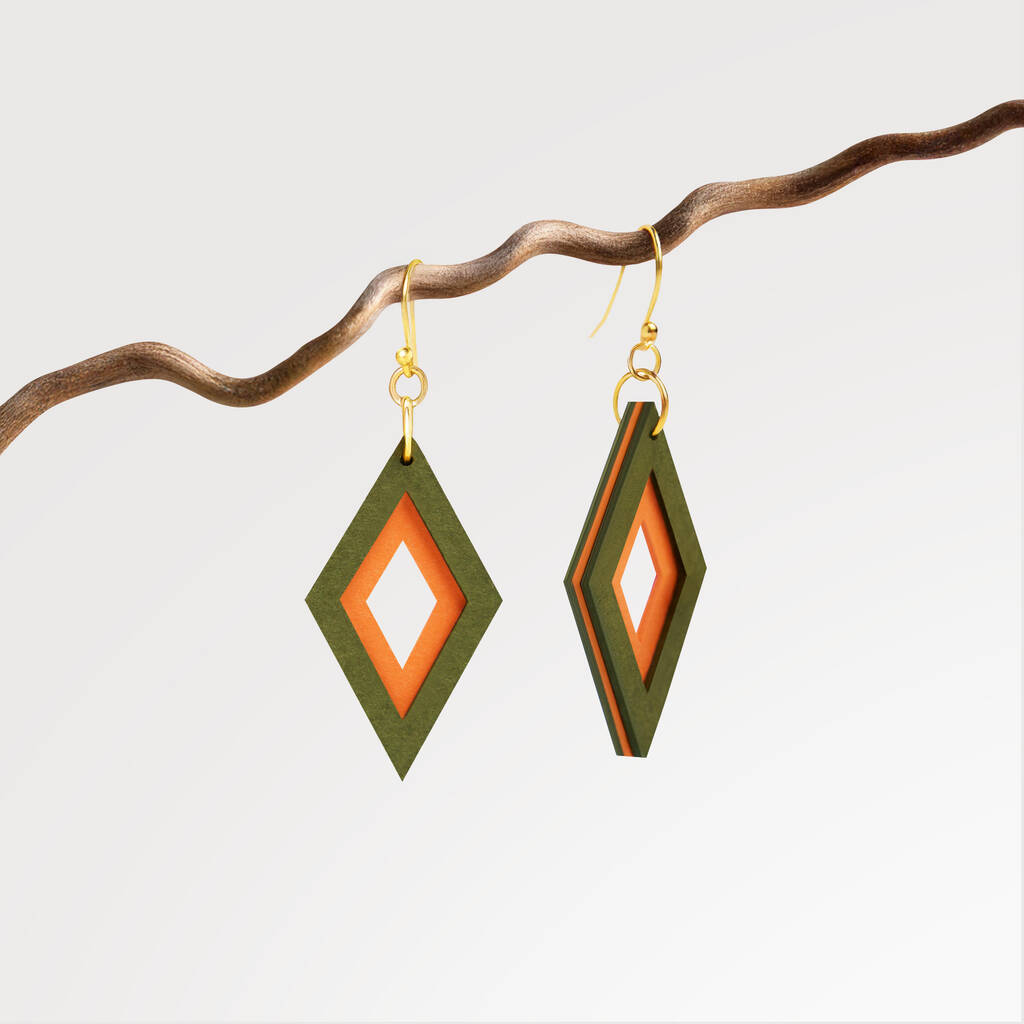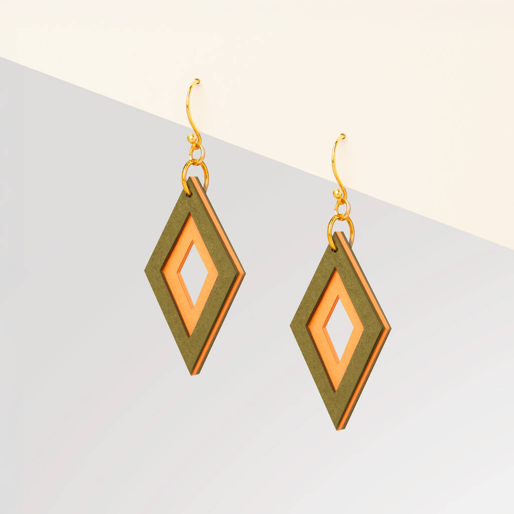 Khaki And Orange Diamond Shaped Layered Earrings • Gold Plated Sterling Silver Hooks