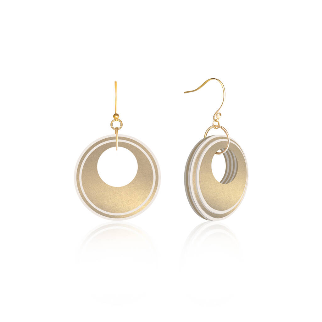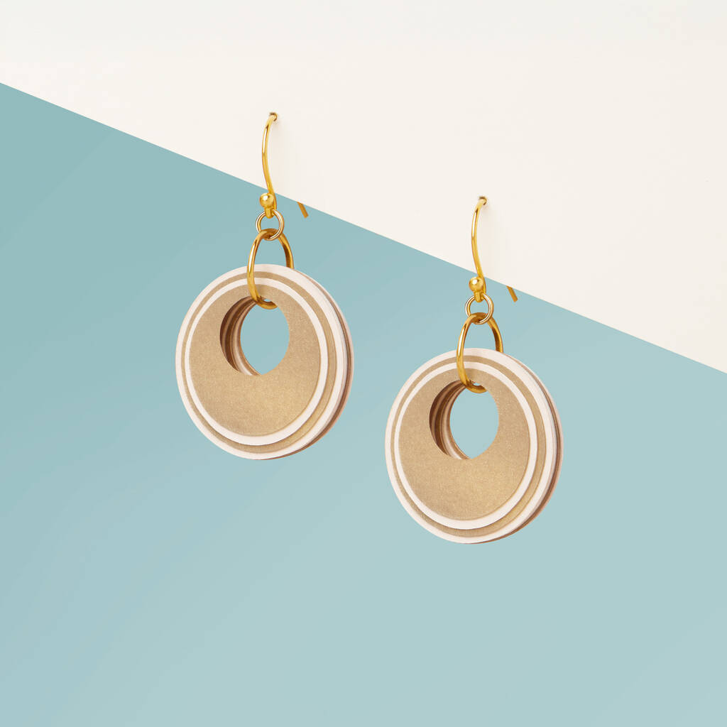 • Pearlescent Taupe And Cream Circular Earrings • Gold Plated Sterling Silver Hooks, thumbnail 9 of 9
