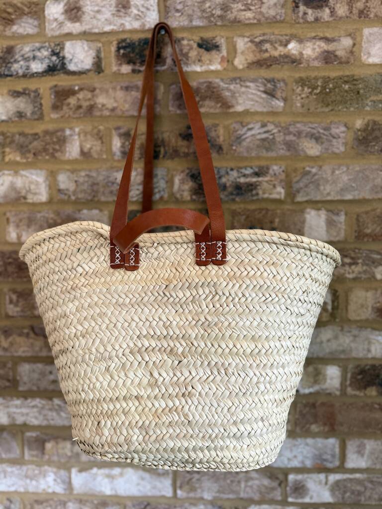 Our timeless, handwoven in Morocco from sustainably sourced palm leaf and finished with double flat leather handles, this basket is generous in size and soft in shape, making it perfect for carrying on the shoulder or by the handles