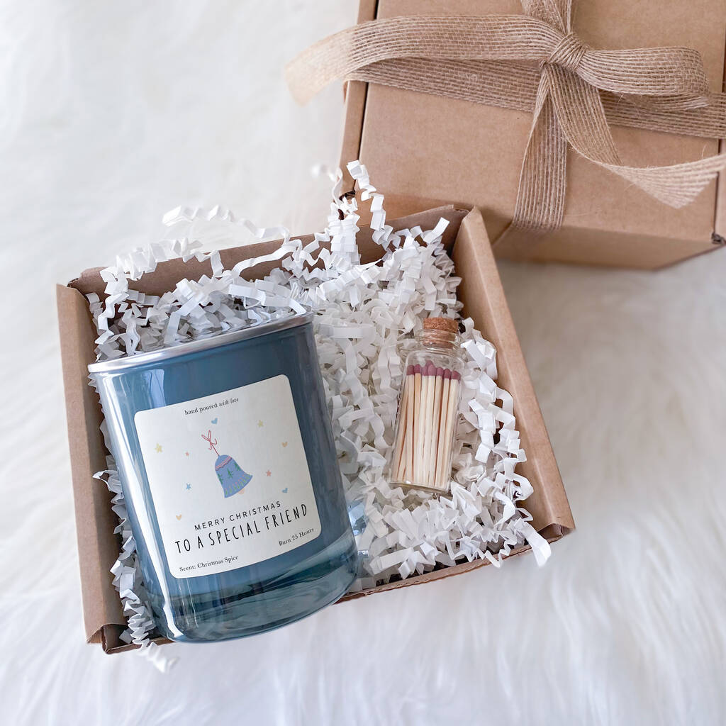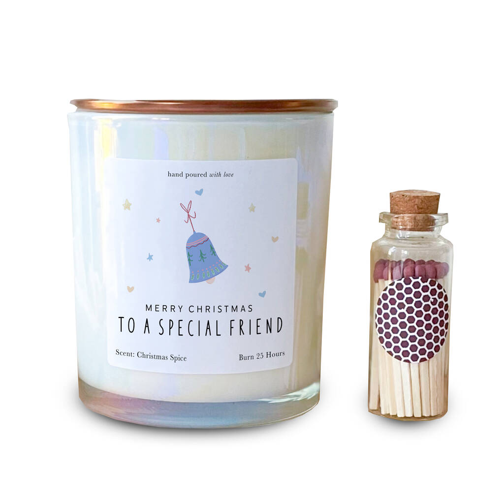 Show your appreciation this festive season with this Merry Christmas to a Special Friend candle. Featuring a charming winter bell illustration, this hand-poured soy wax candle is a heartfelt way to wish your friend a joyful Christmas. Perfect for cosy winter nights and as a thoughtful seasonal keepsake.
