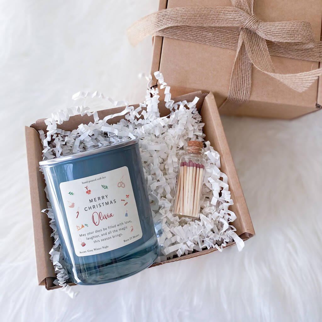 Bring warmth and festive cheer to someone special with this beautifully personalised Christmas candle. Featuring a charming seasonal design and your chosen name, this elegant candle makes the perfect Christmas gift for friends, family, or loved ones. Hand-poured with care and finished with a festive label, it’s a thoughtful way to spread joy this holiday season.