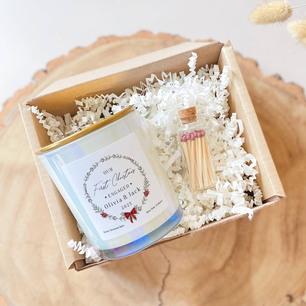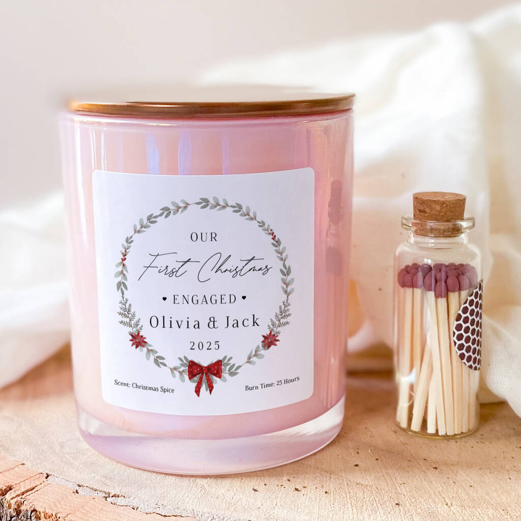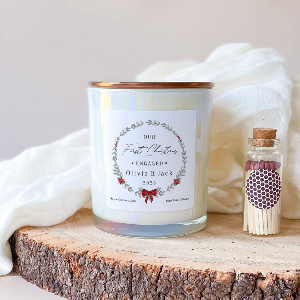 Celebrate your engagement this festive season with this beautifully personalised candle. Designed with a delicate winter wreath featuring red berries, greenery and a charming bow, it’s a lovely way to mark your first Christmas as an engaged couple. Customised with your names, it’s a heartfelt keepsake and a perfect romantic gift for your fiancé or fiancée.