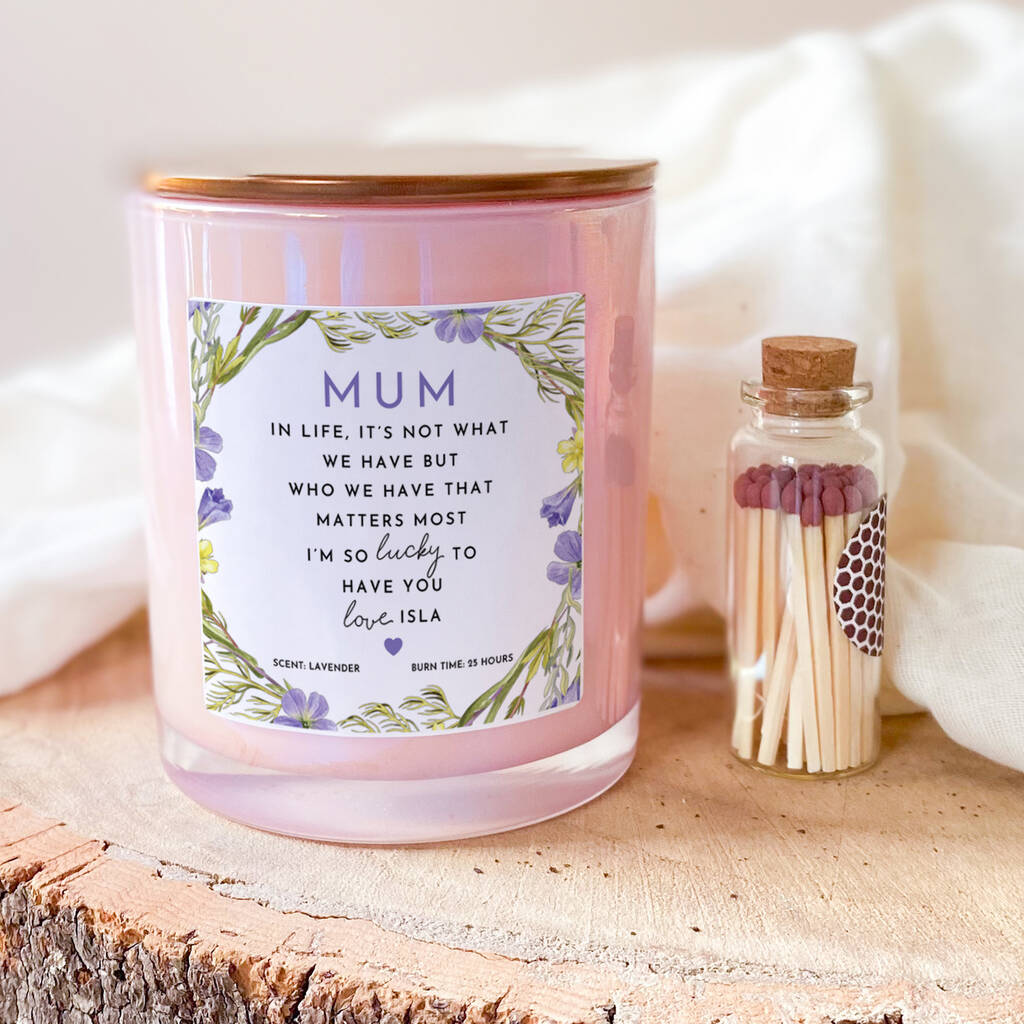 Hand-poured personalised candle with floral design, a thoughtful gift for Mum to show love and gratitude on birthdays, Mother’s Day, or special occasions.