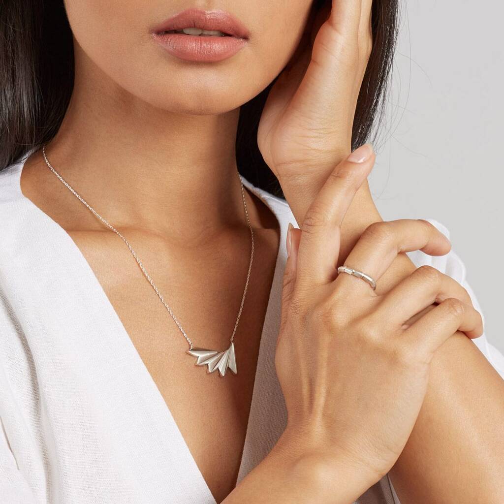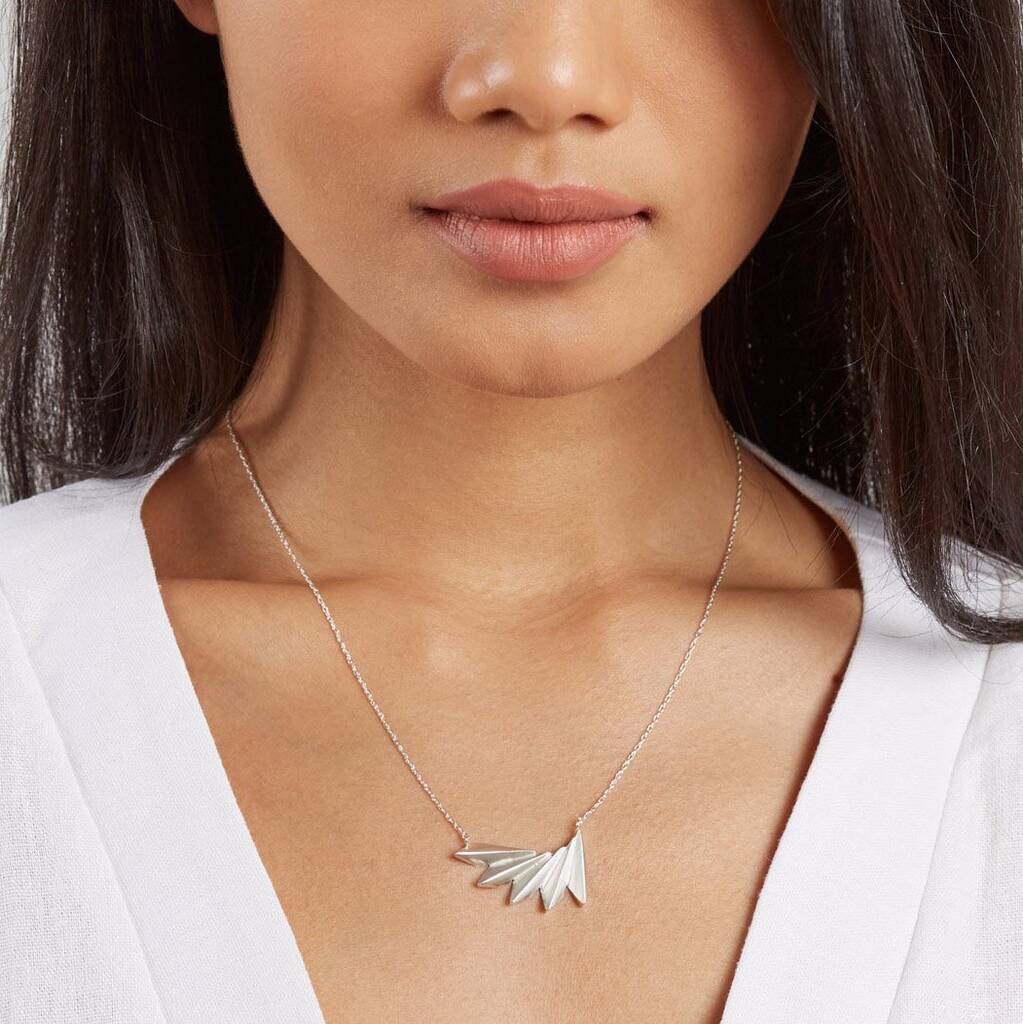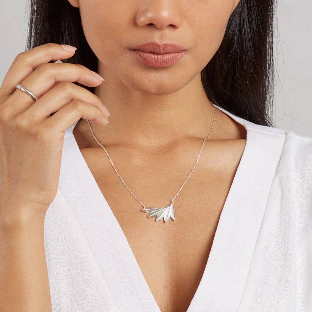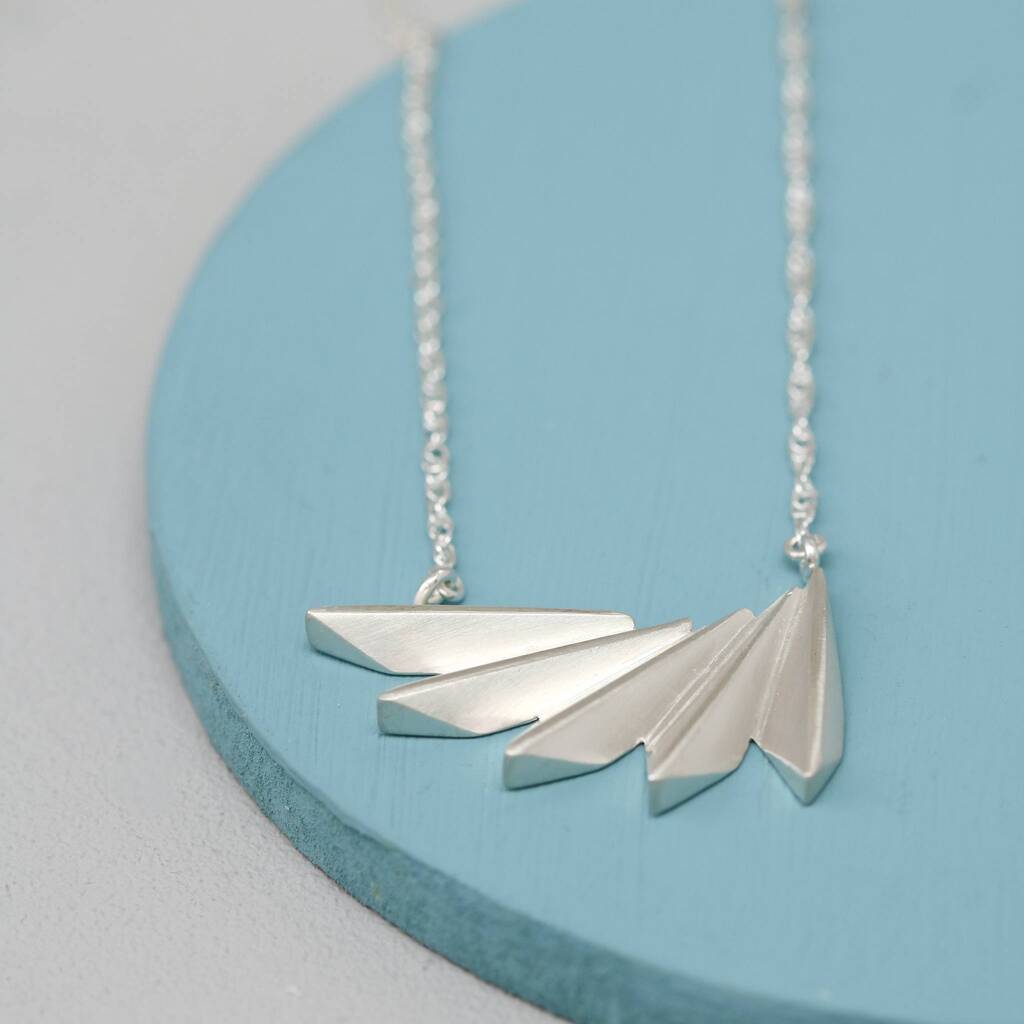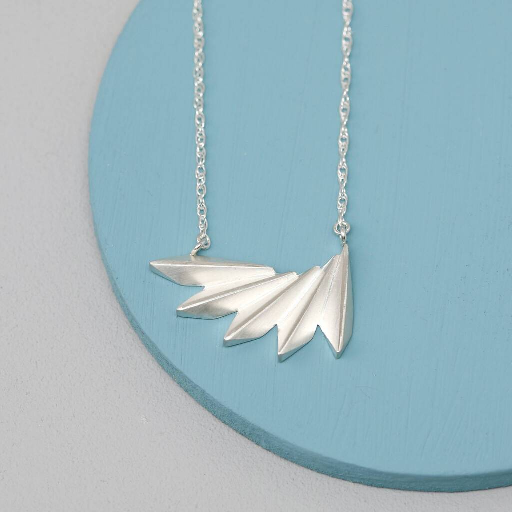 Each Art Deco pendant necklace is handmade from solid sterling silver and features a sculpted fan-shaped pendant inspired by vintage Art Deco architecture.