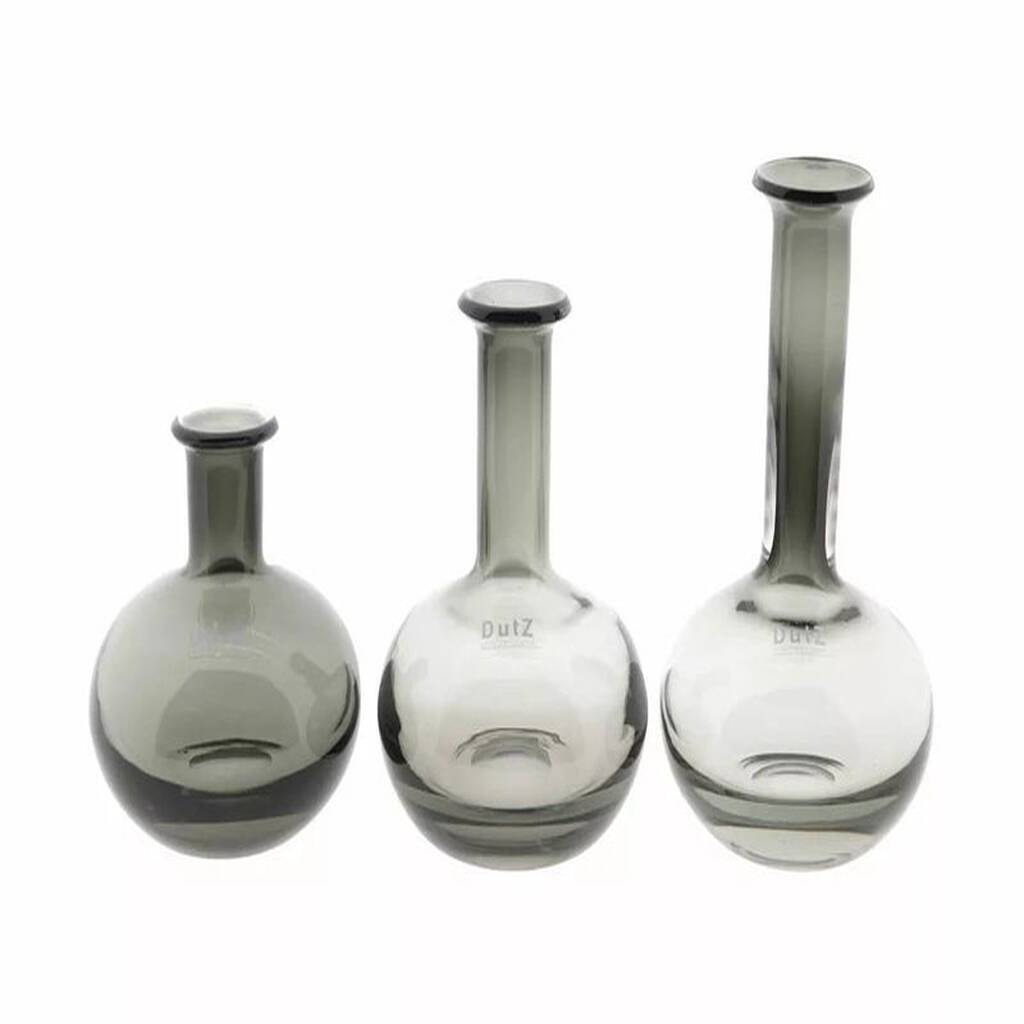 Rich, heavy, luxurious glass vase set made from thick European glass, mouth blown with elegant necks, perfect for layered displays, flowers, or standalone decor.The Manuela vase set includes six mouth blown glass vases designed for layered and versatile styling. The set features three sizes, small, medium, and large, with two of each model included. With long necks and softly bulging bases, these vases are easy to use for small floral arrangements or as standalone decorative objects. Arrange them together on a plate or place individually on tables, side tables, bathrooms, bedrooms, or hallways. Each piece is handmade by European glassblowers, creating subtle variations. Made from rich, heavy, luxurious glass, approximately 3 mm thick, with colour mixed within the glass itself.