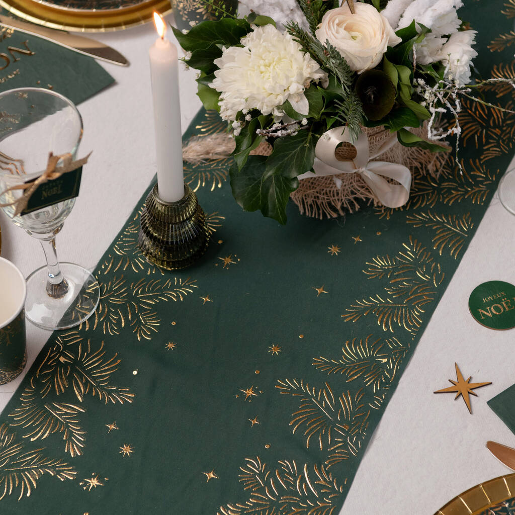 Elevate your festive dining with our Elegant Green Gold Leaves Table Runner, expertly crafted from premium polyester crepe for a touch of sophistication.