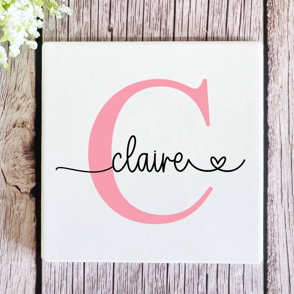 Personalised Pink Porcelain Square Coaster With Intial And Name Gift