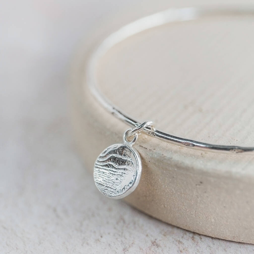 Handmade sterling silver bangle with a small cuttlefish textured circle charm.