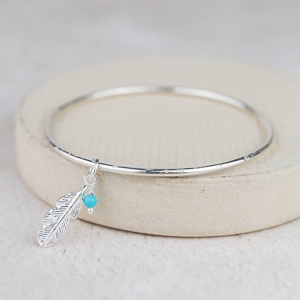Sterling Silver Feather And Turquoise Charm Bangle