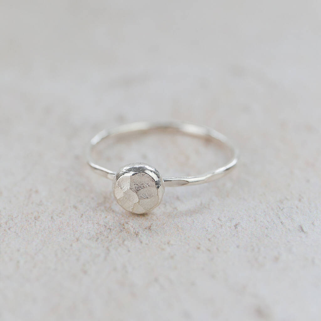Our sterling silver nugget charm rings come in a small (UK size K), medium (UK size N) and large (UK size P). Each sterling silver nugget charm is organically formed using recycled sterling silver and is approximately 6mm across, with a slight hammered texture. Soldered onto a sterling silver delicate thin ring.