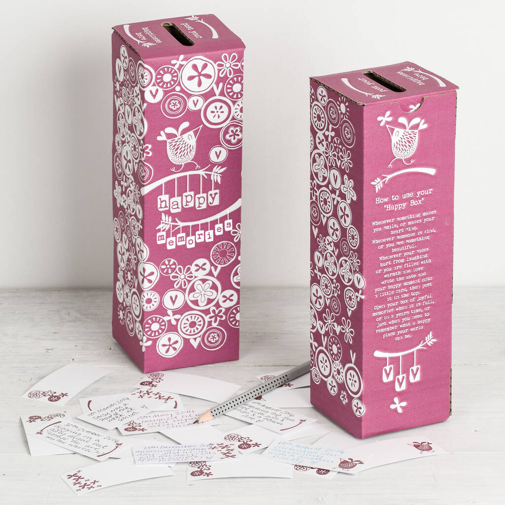 On the back of the box, the following words are written: How to use your Happy Memories Box - Whenever something makes you smile, or your heart sing. Whenever someone is kind or you see something beautiful.