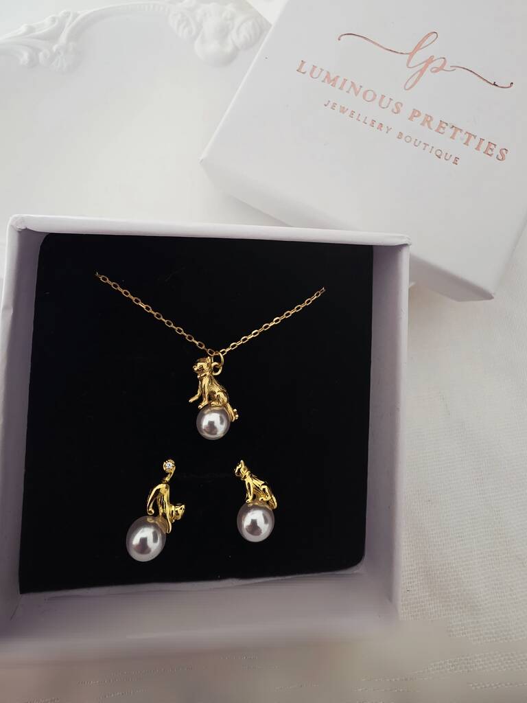 Elegant, whimsical, and full of heart, this Gold Cat & Pearl Jewellery Set is the perfect blend of playful charm and classic sophistication. Each piece features a beautifully detailed gold Cat figurine gently perched atop a lustrous ivory pearl, symbolising loyalty, affection, and grace.