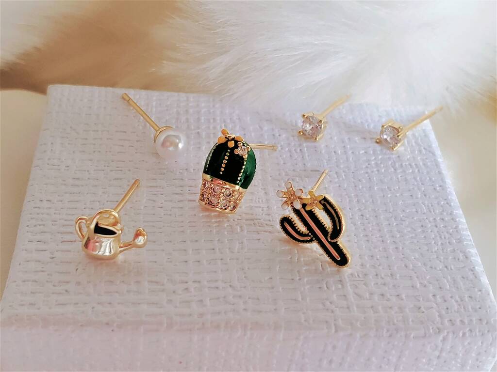 • Cactus And Watering Can Mismatched Stud Earrings Set 14 K Gold Plated With Pearl, Gift For Her Plant Lover Jewellery, thumbnail 5 of 9