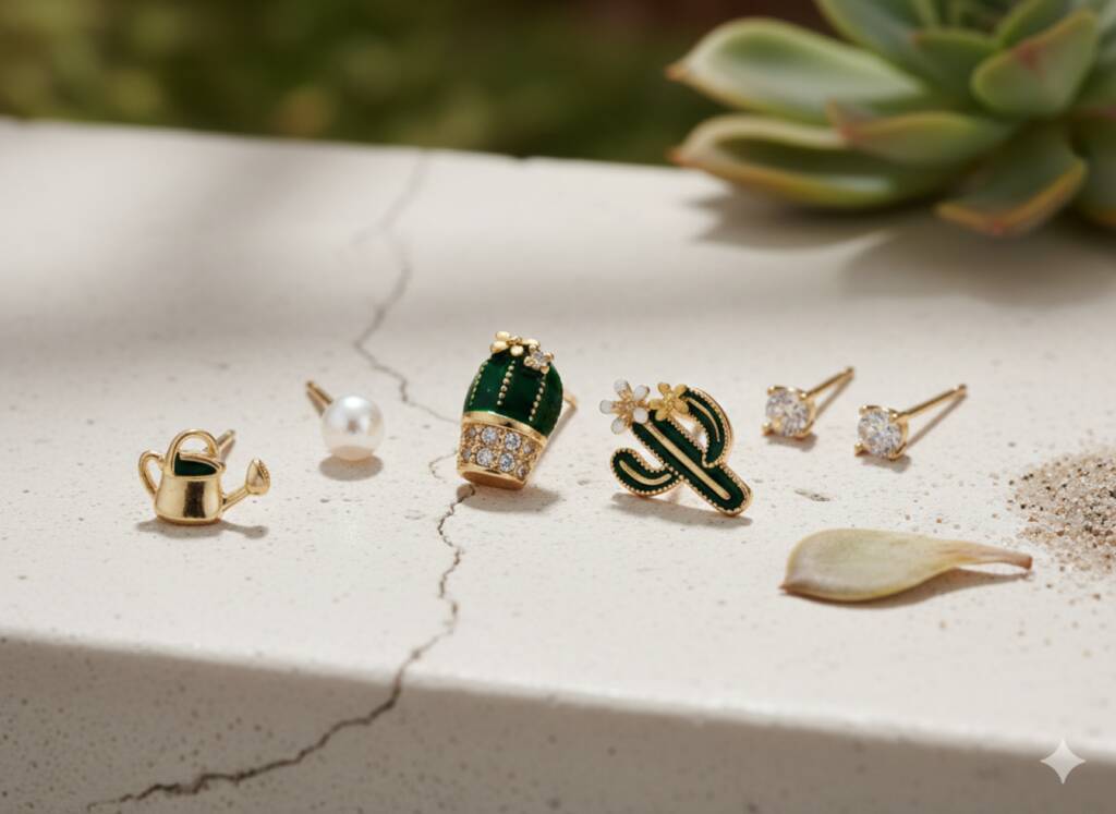 Cactus And Watering Can Mismatched Stud Earrings Set 14 K Gold Plated With Pearl, Gift For Her Plant Lover Jewellery