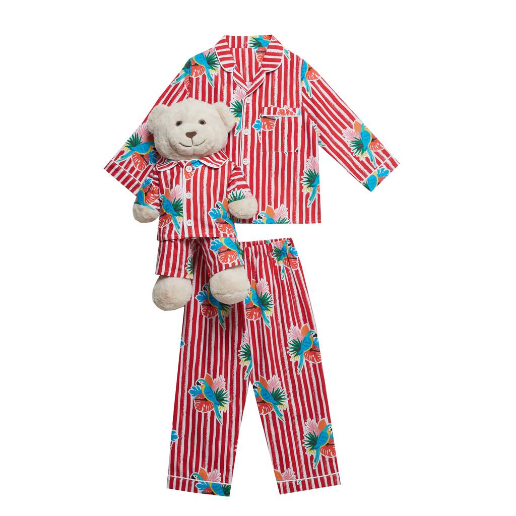 A playful cotton pyjama set with a matching teddy bear companion—crafted for comfort, fun, and sweet dreams.The Pappagallo Pyjama Set is designed for children who love both style and comfort. Crafted from 100% premium cotton, this unisex pyjama set features a vibrant multicolour parrot and stripe print, making bedtime a joyful occasion. Each set includes a cuddly teddy bear dressed in the same pyjamas, giving little ones a delightful sleep companion. The breathable fabric ensures comfort throughout the night, while the matching design adds fun to bedtime rituals. Delivered in a premium gift box, it’s an ideal present for birthdays or special occasions.