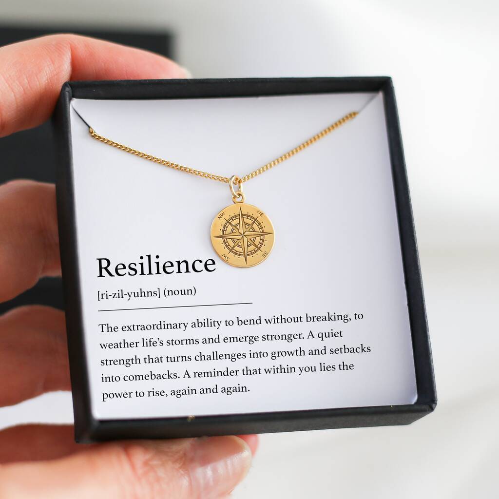A meaningful compass necklace with the Resilience card – a symbol of strength, courage, and the ability to find your way, even through life’s storms.