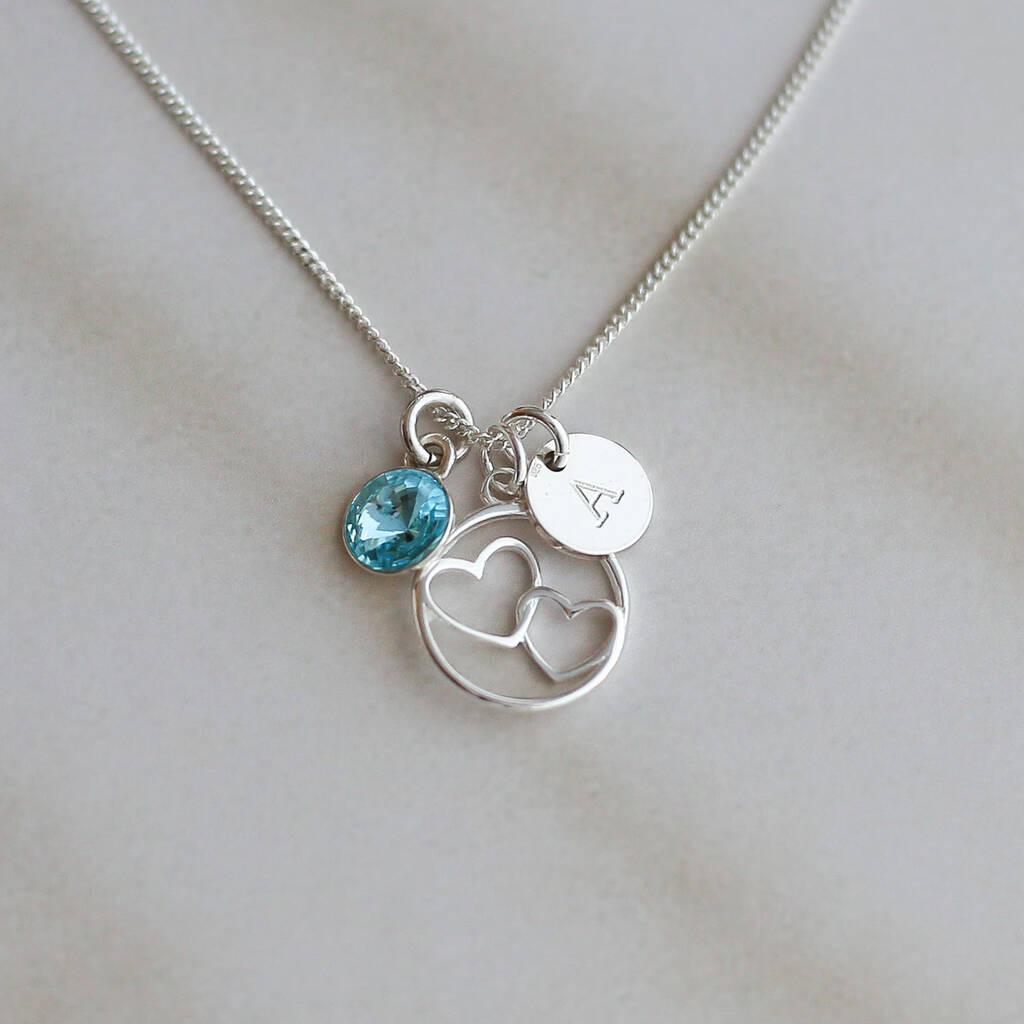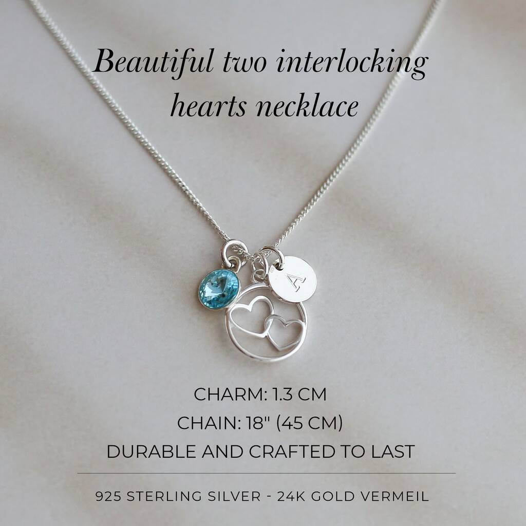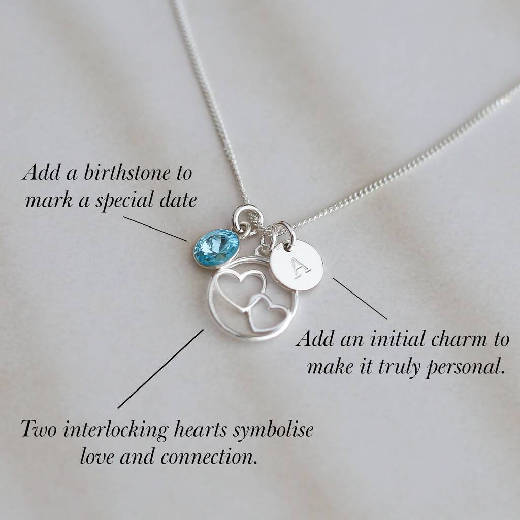 A delicate double-heart necklace with optional birthstone and initial - a meaningful piece celebrating love, connection and the people who matter most.