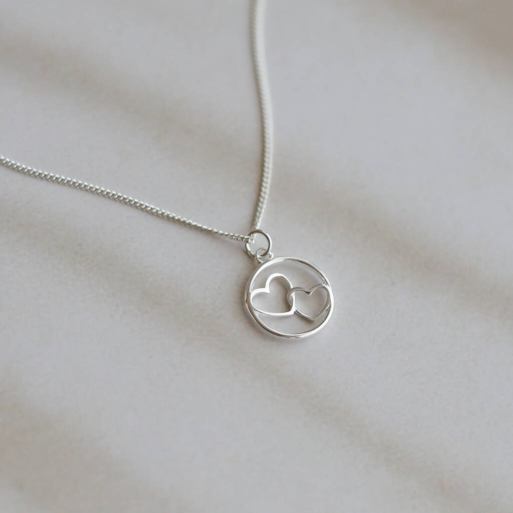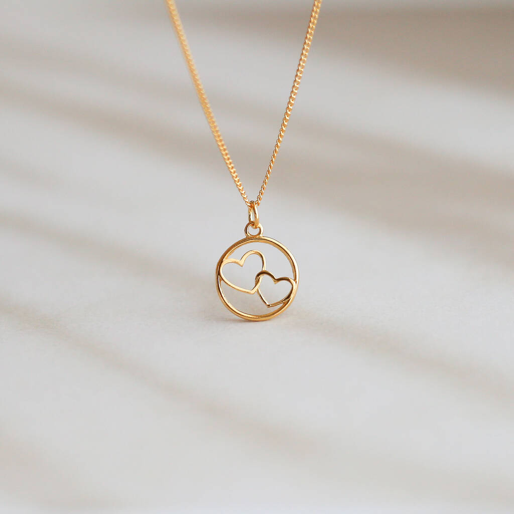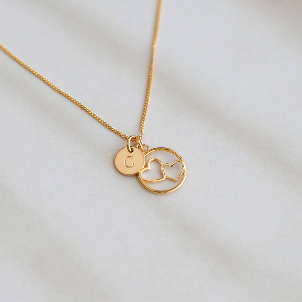 A delicate double-heart necklace celebrating love, connection, and the special bond you share. The tiny two-heart charm can be personalised with an optional birthstone and initial disc, creating a piece that feels uniquely yours.