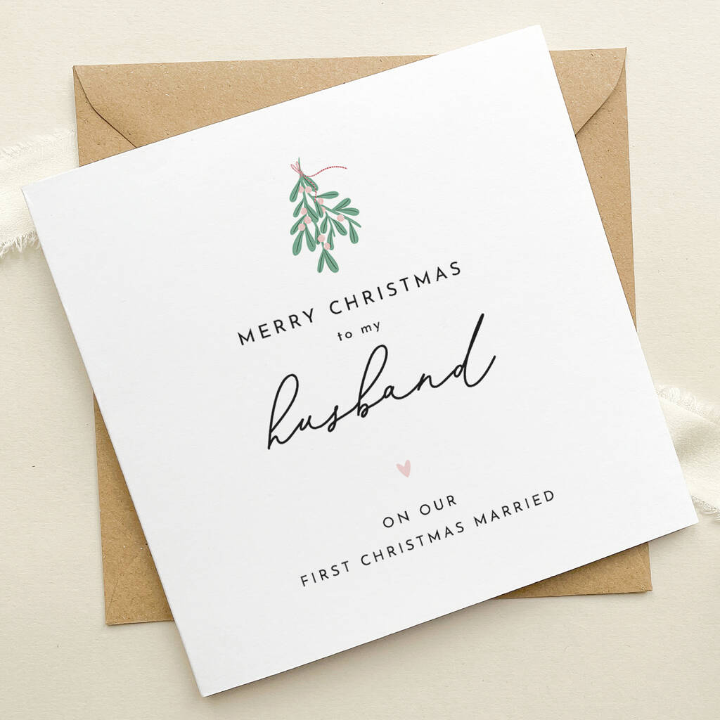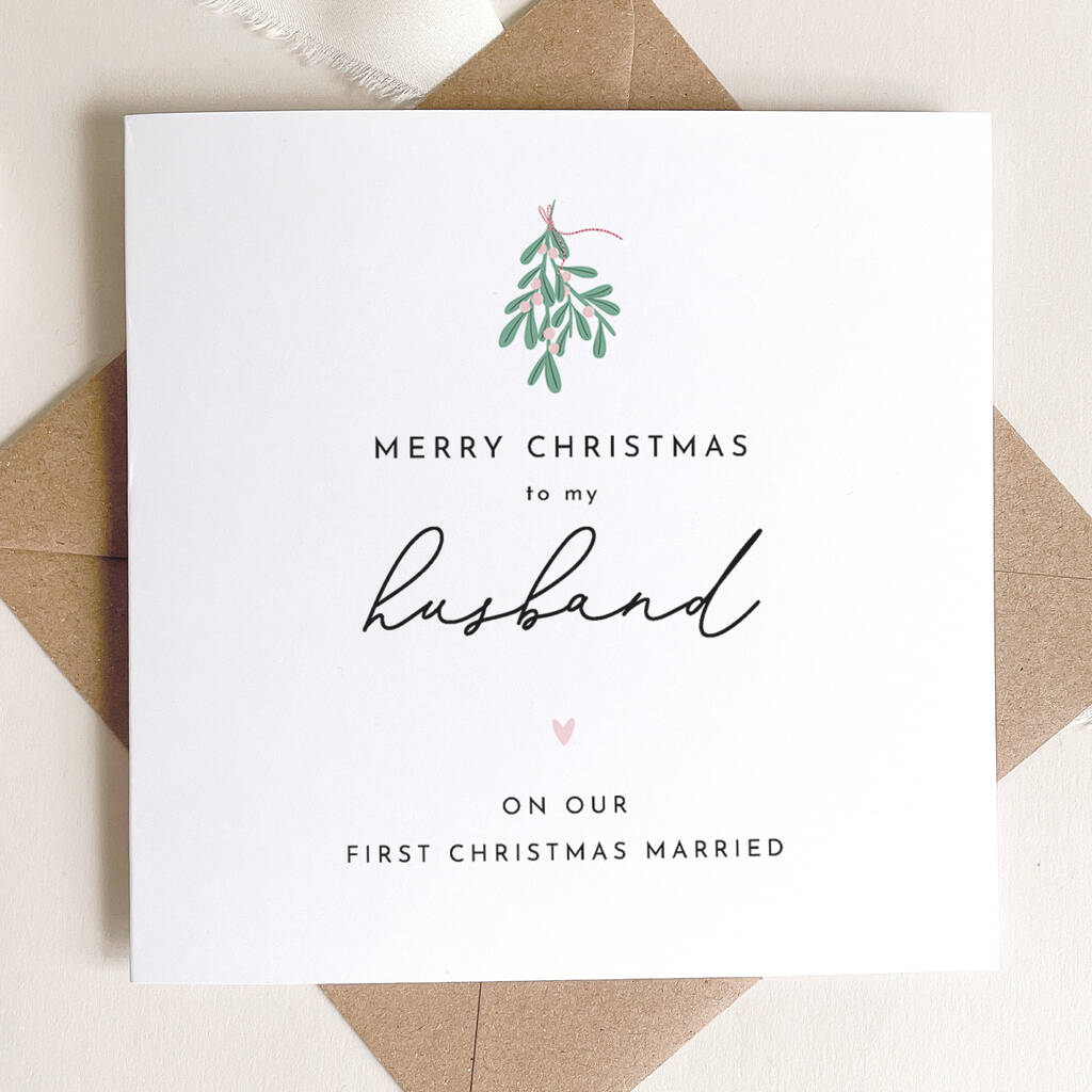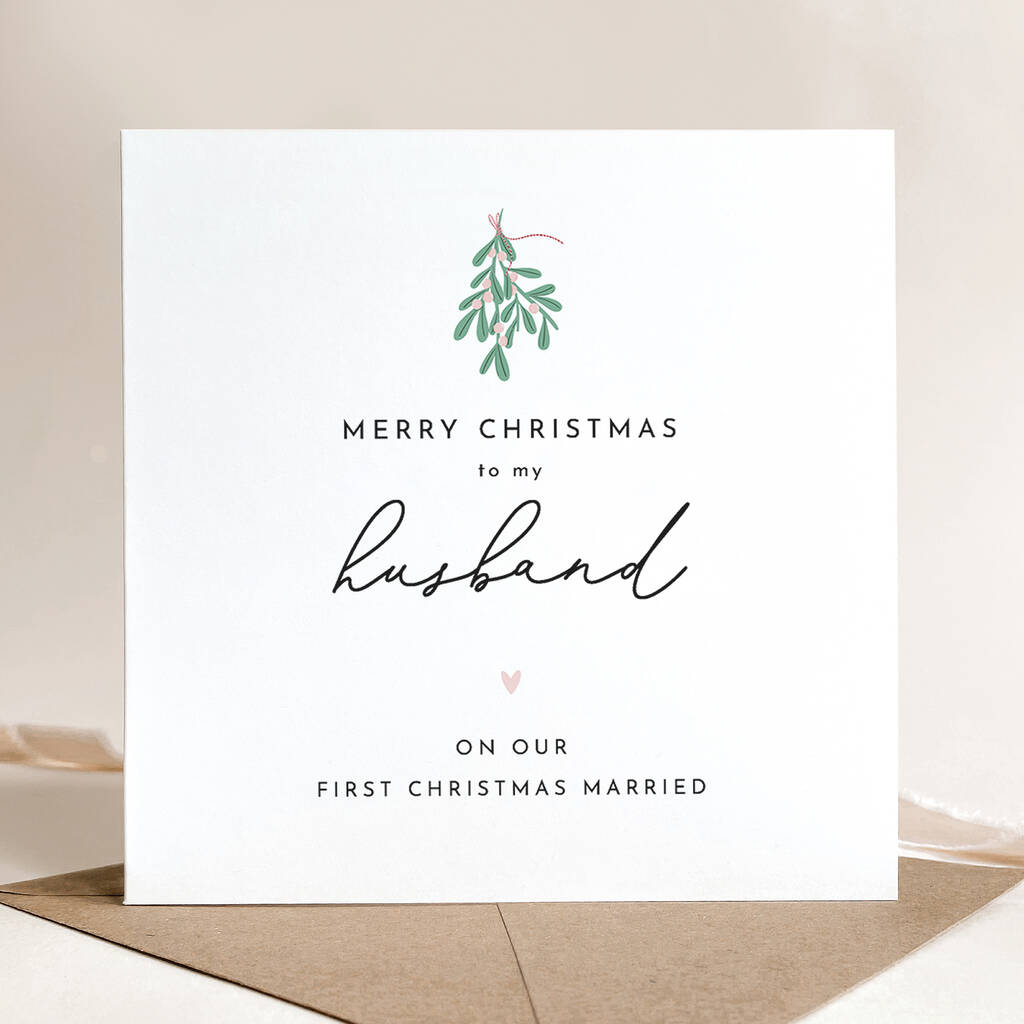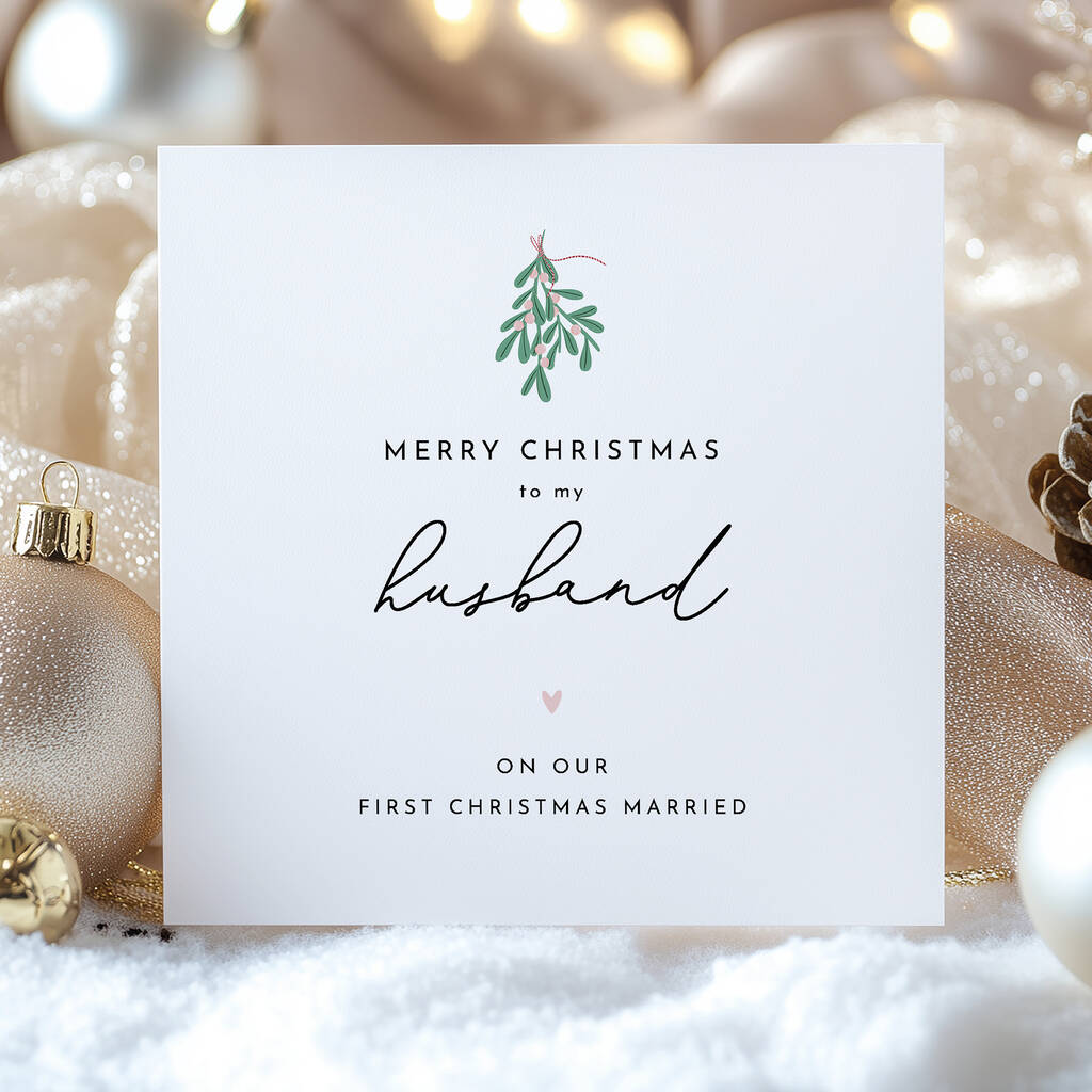 Husband First Married Christmas Card: Mistletoe And Pink Heart Design