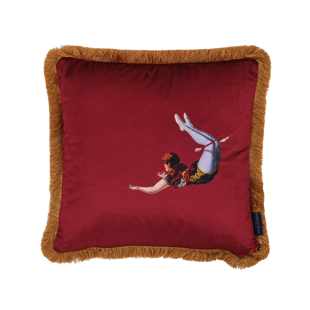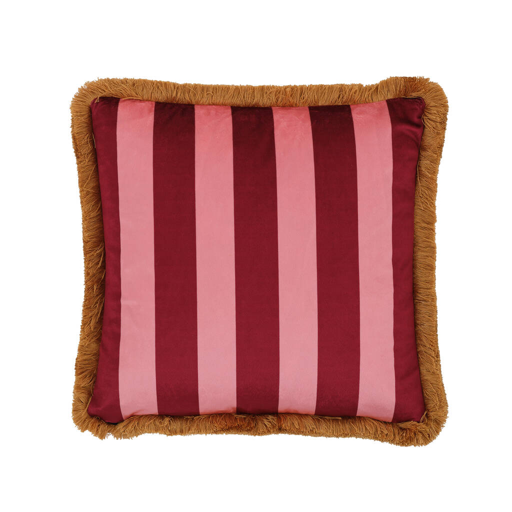 Trapeze Girl Double Sided Velvet Cushion Deep Berry Red And Stripes