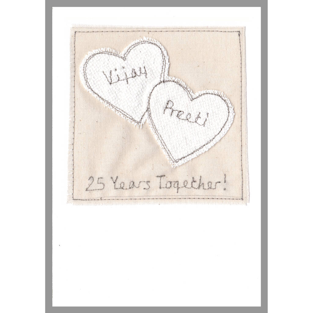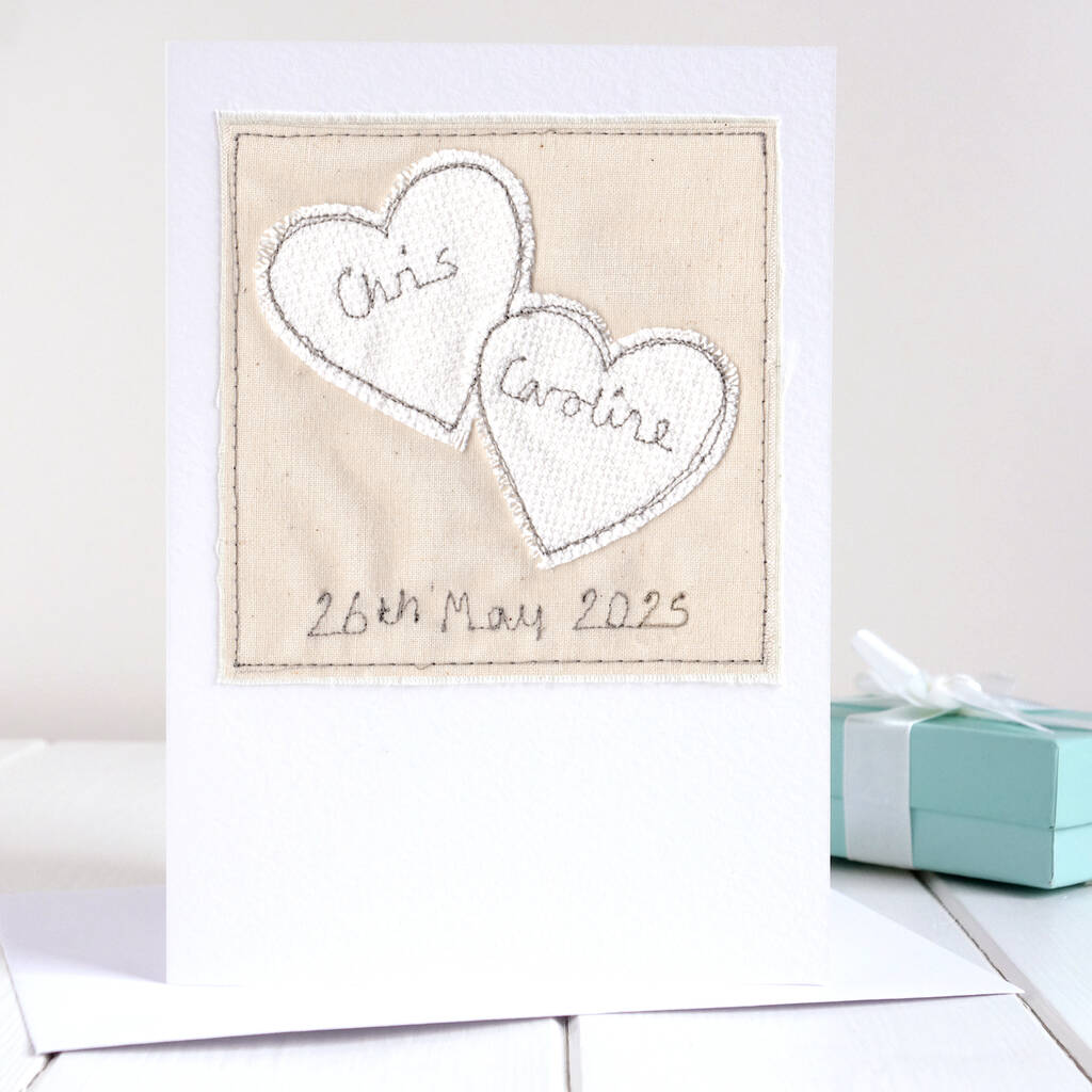 On the 2 HEARTS card, your chosen names are embroidered inside each heart, with your own choice of words embroidered below (We can embroider names of up to 10 characters max inside each heart)