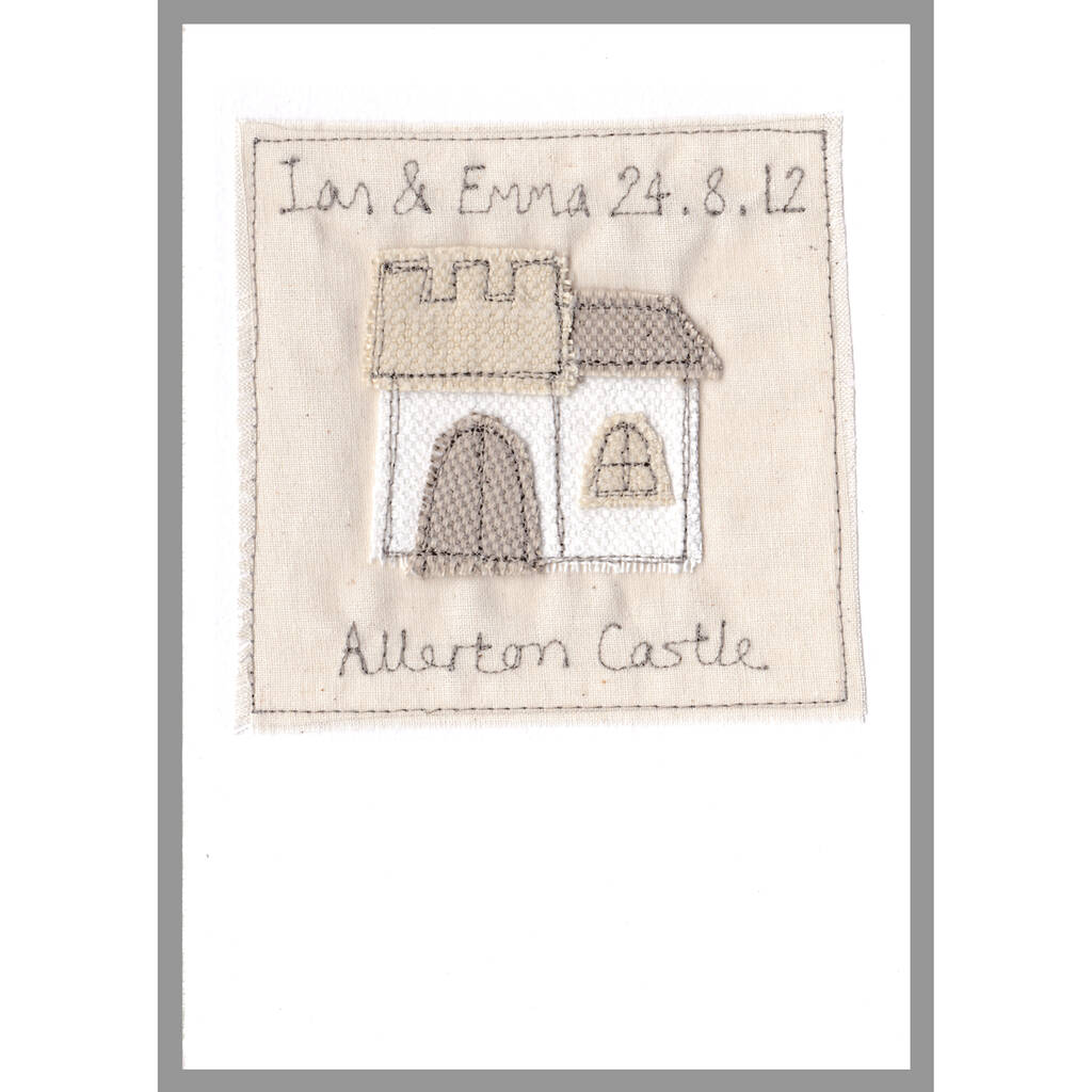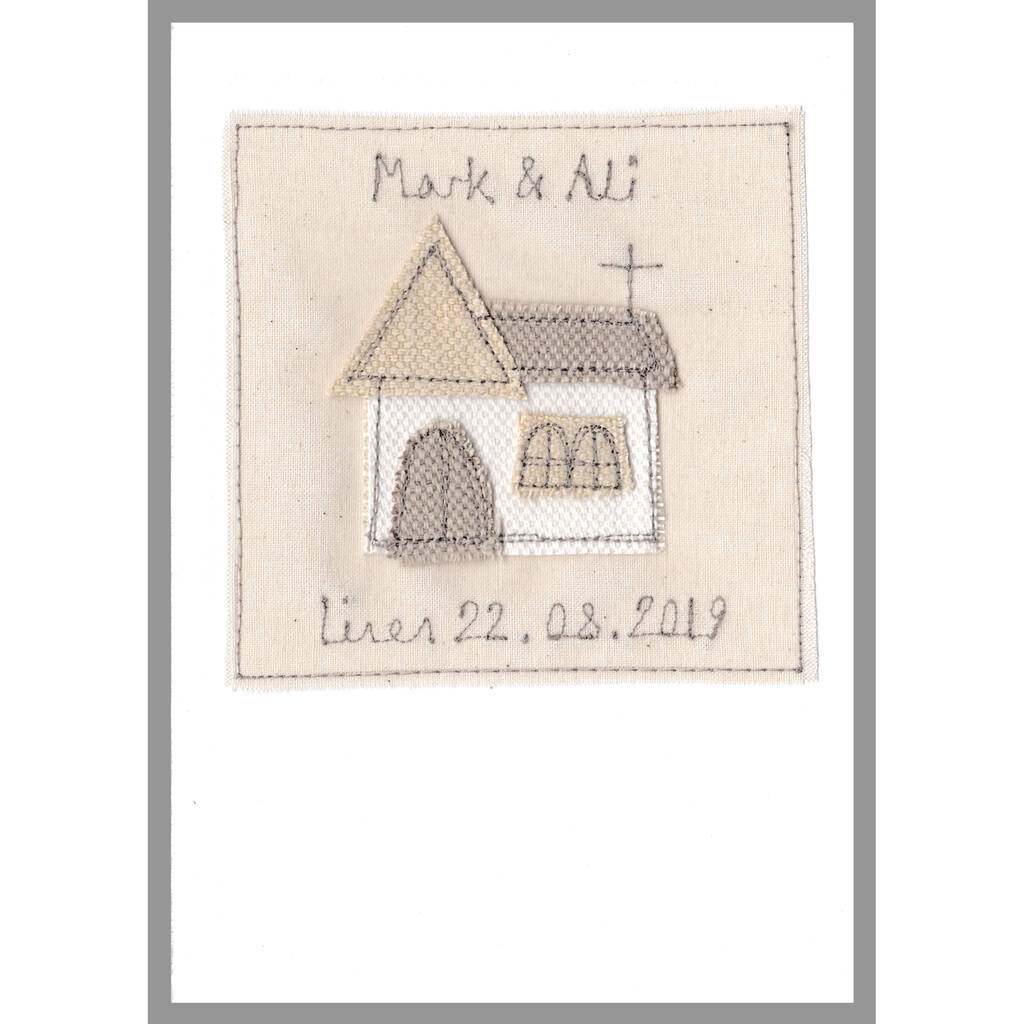 Handmade to order, this embroidered fabric card is available in 5 designs. Choose from 2 HEARTS, BIG HEART, CHURCH, CAKE or CASTLE.