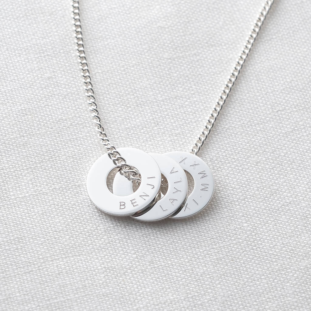 This Family Circle Necklace is a modern keepsake that speaks of connection and meaning. Each solid sterling silver circle is engraved with your chosen names, dates or coordinates.