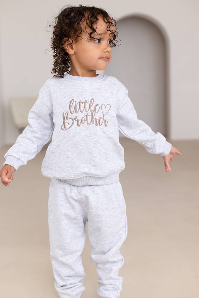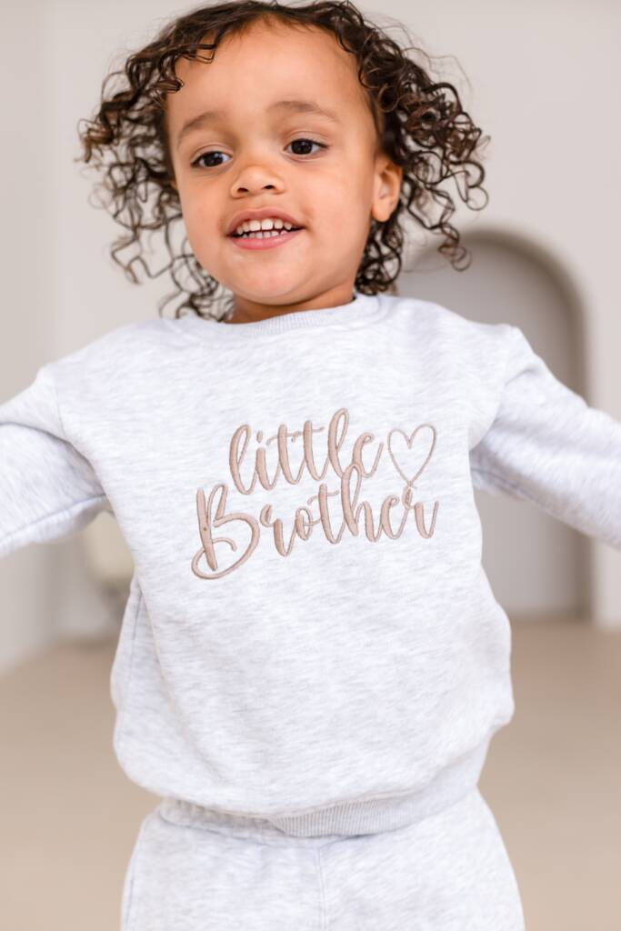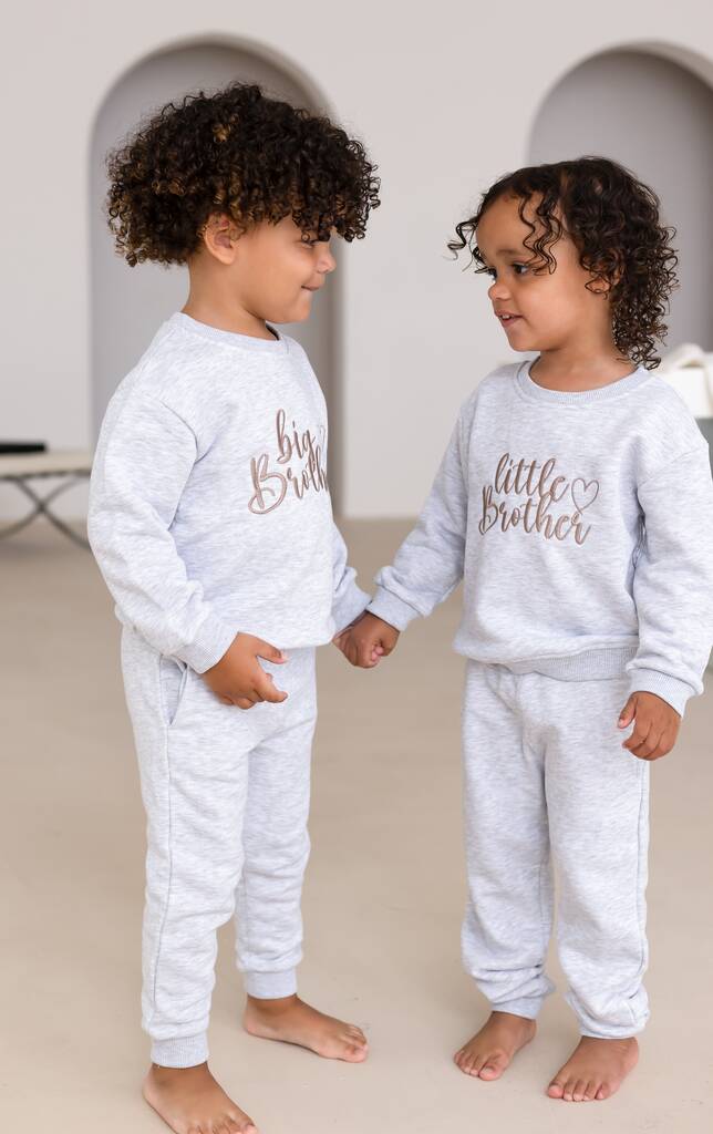 Style siblings up in these matching embroidered sweatshirts. Select from 'Big/Little' and 'Brother/Sister' before adding product to cart. Please note £26 is the price for 1 jumper, if you wish to buy a set of 2 please add 2 seperate jumpers to the basket.Second one can be added to basket when checking out the first. Models wear ash grey with copper thread and supporting images show ivory with soft gold thread - Full ange of colours available.