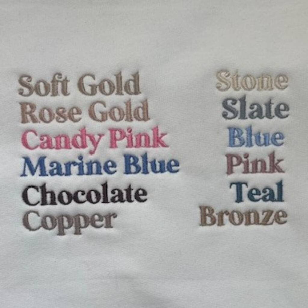 Sweatshirt is available in a choice of colours - stone, ash grey, ivory, baby blue, bubblegum pink, mint, dark rose pink and mocha and a full range of thread colours.