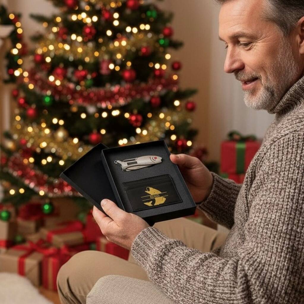 Fishing gift set with multi-function tool and Nappa leather wallet. A lovely gift for enthusiasts with fantastic, personalised monogramming and engraving options.