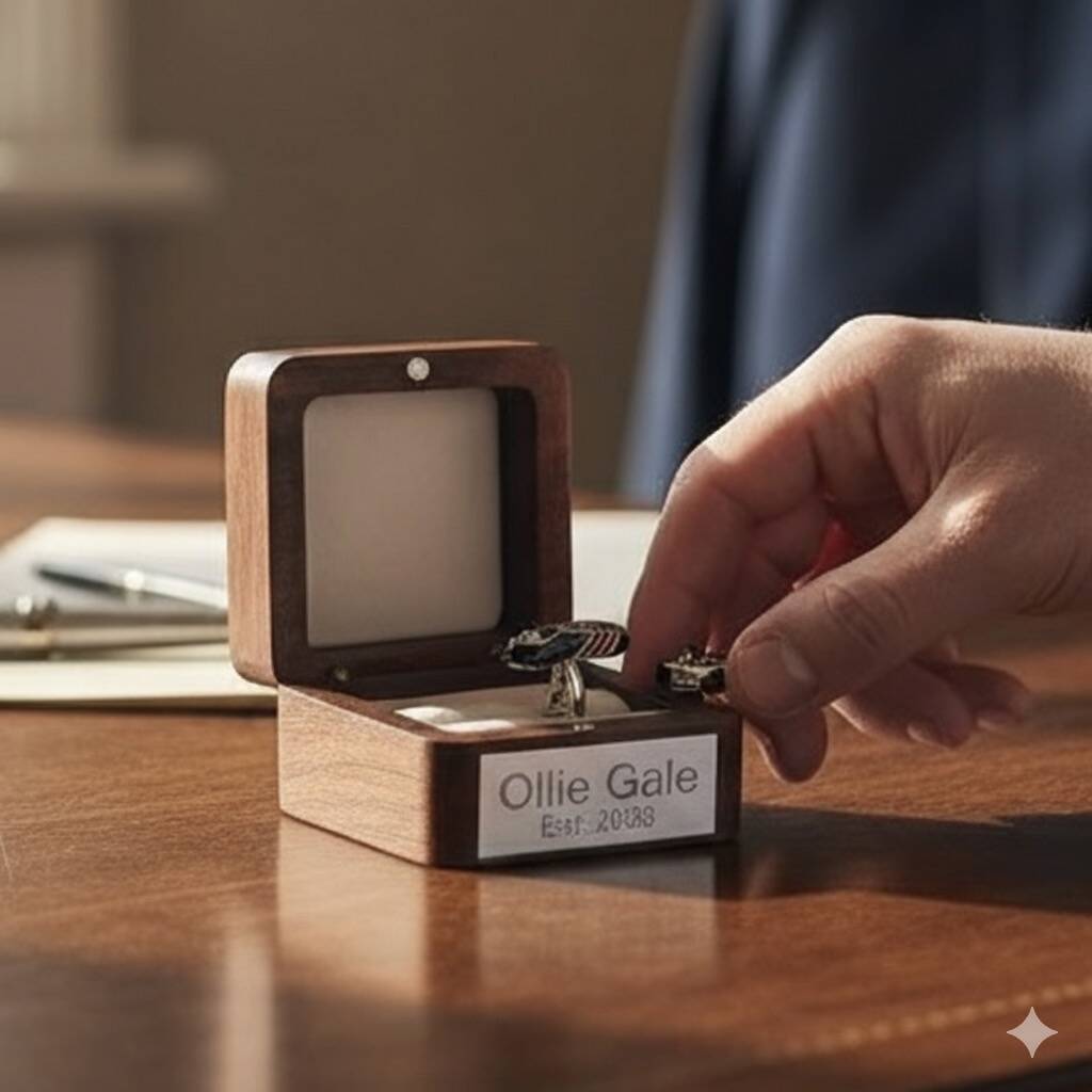 Sleek and stylish cufflinks for football fans or players in a personalised walnut box.